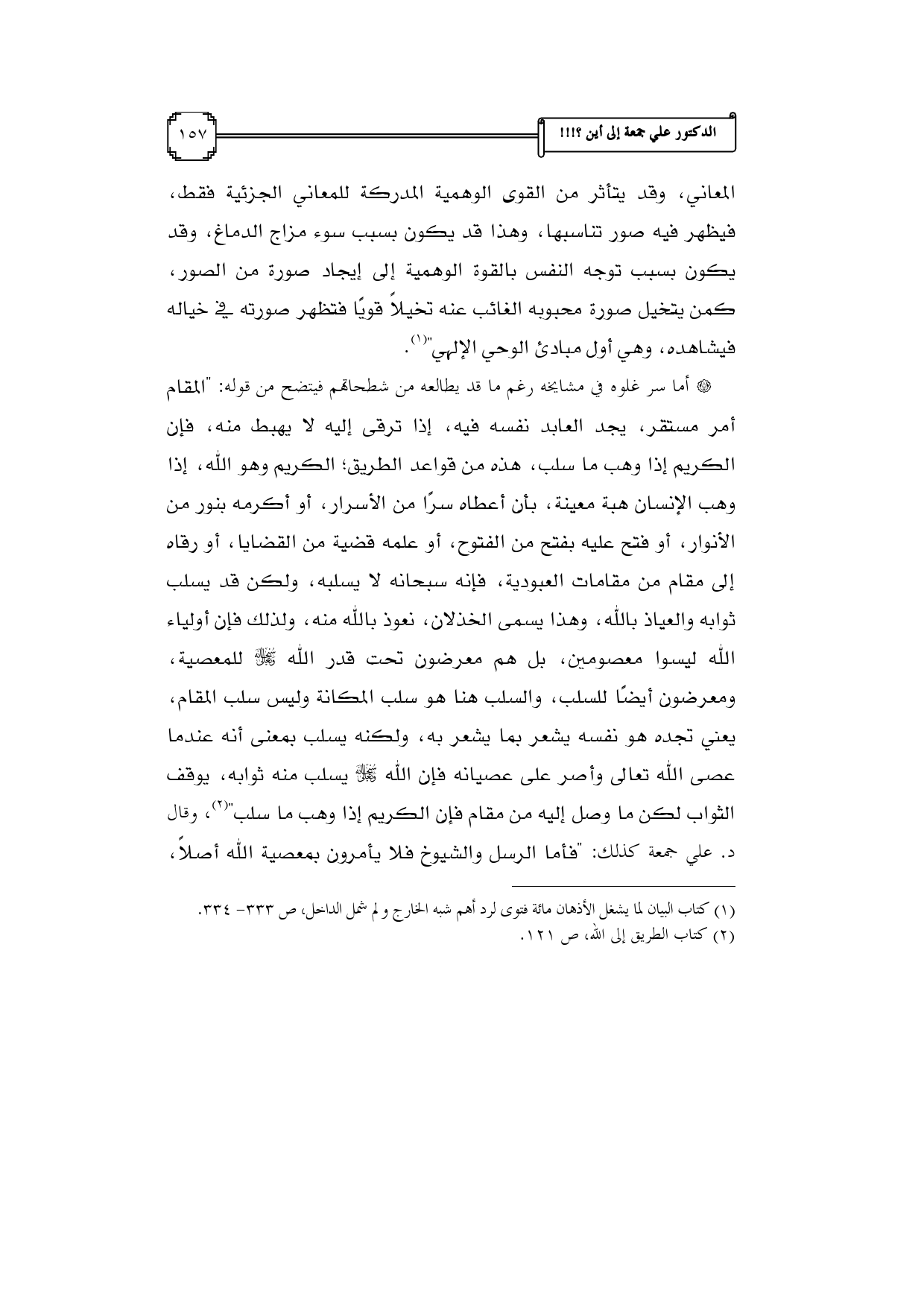 * أما سر غلوه في مشايخه رغم ما قد يطالعه من شطحاتهم فيتضح من قوله: "المقام أمر مستقر، يجد العابد نفسه فيه، إذا ترقى إليه لا يهبط منه، فإن الكريم إذا وهب ما سلب، هذه من قواعد الطريق؛ الكريم وهو الله، إذا وهب الإنسان هبة معينة، بأن أعطاه سرًا من الأسرار، أو أكرمه بنور من الأنوار، أو فتح عليه بفتح من الفتوح، أو علمه قضية من القضايا، أو رقاه إلى مقام من مقامات العبودية، فإنه سبحانه لا يسلبه، ولكن قد يسلب ثوابه والعياذ بالله، وهذا يسمى الخذلان، نعوذ بالله منه، ولذلك فإن أولياء الله ليسوا معصومين، بل هم معرضون تحت قدر الله سبحانه وتعالى للمعصية، ومعرضون أيضًا للسلب، والسلب هنا هو سلب المكانة وليس سلب المقام، يعني تجده هو نفسه يشعر بما يشعر به، ولكنه يسلب بمعنى أنه عندما عصى الله تعالى وأصر على عصيانه فإن الله سبحانه وتعالى يسلب منه ثوابه، يوقف الثواب لكن ما وصل إليه من مقام فإن الكريم إذا وهب ما سلب" (¬2)، وقال د. علي جمعة كذلك: "فأما الرسل والشيوخ فلا يأمرون بمعصية الله أصلاً،
