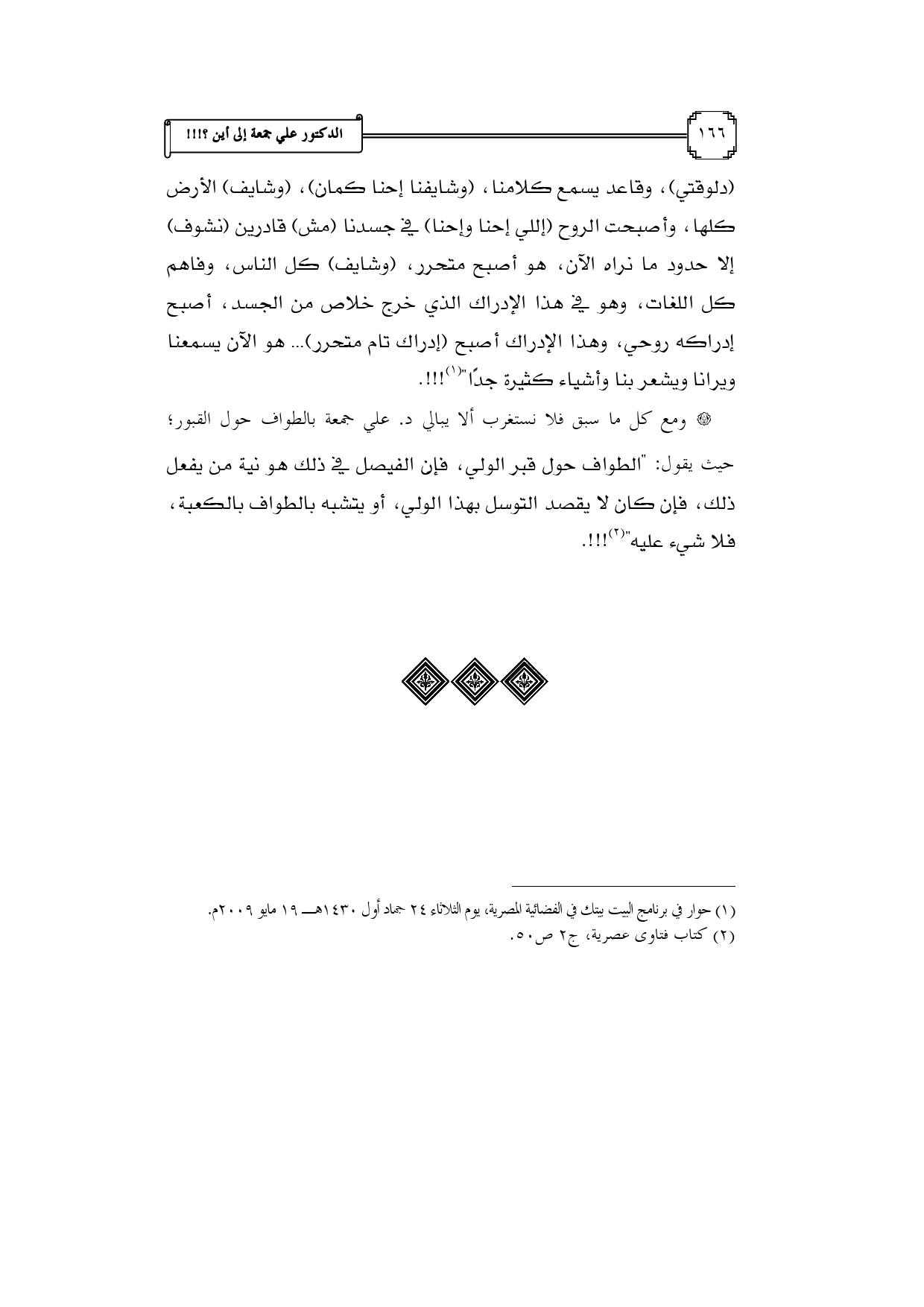 * ومع كل ما سبق فلا نستغرب ألا يبالي د. علي جمعة بالطواف حول القبور؛ حيث يقول: "الطواف حول قبر الولي، فإن الفيصل في ذلك هو نية من يفعل ذلك، فإن كان لا يقصد التوسل بهذا الولي، أو يتشبه بالطواف بالكعبة، فلا شيء عليه" (¬2)!!!.