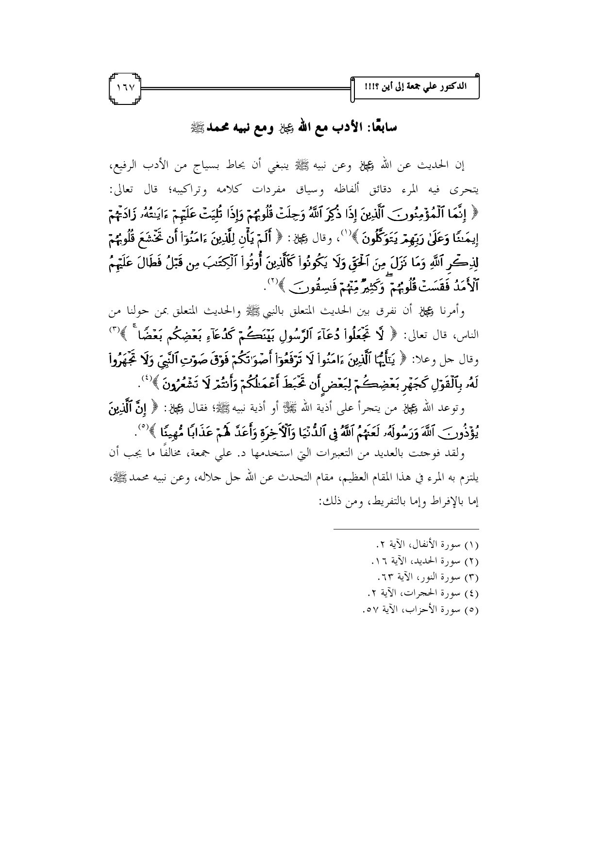 وأمرنا عز وجل أن نفرق بين الحديث المتعلق بالنبي صلى الله عليه وسلم والحديث المتعلق بمن حولنا من الناس، قال تعالى: {لَا تَجْعَلُوا دُعَاءَ الرَّسُولِ بَيْنَكُمْ كَدُعَاءِ بَعْضِكُمْ بَعْضًا} (¬3) وقال جل وعلا: {يَا أَيُّهَا الَّذِينَ آمَنُوا لَا تَرْفَعُوا أَصْوَاتَكُمْ فَوْقَ صَوْتِ النَّبِيِّ وَلَا تَجْهَرُوا لَهُ بِالْقَوْلِ كَجَهْرِ بَعْضِكُمْ لِبَعْضٍ أَنْ تَحْبَطَ أَعْمَالُكُمْ وَأَنْتُمْ لَا تَشْعُرُونَ} (¬4).