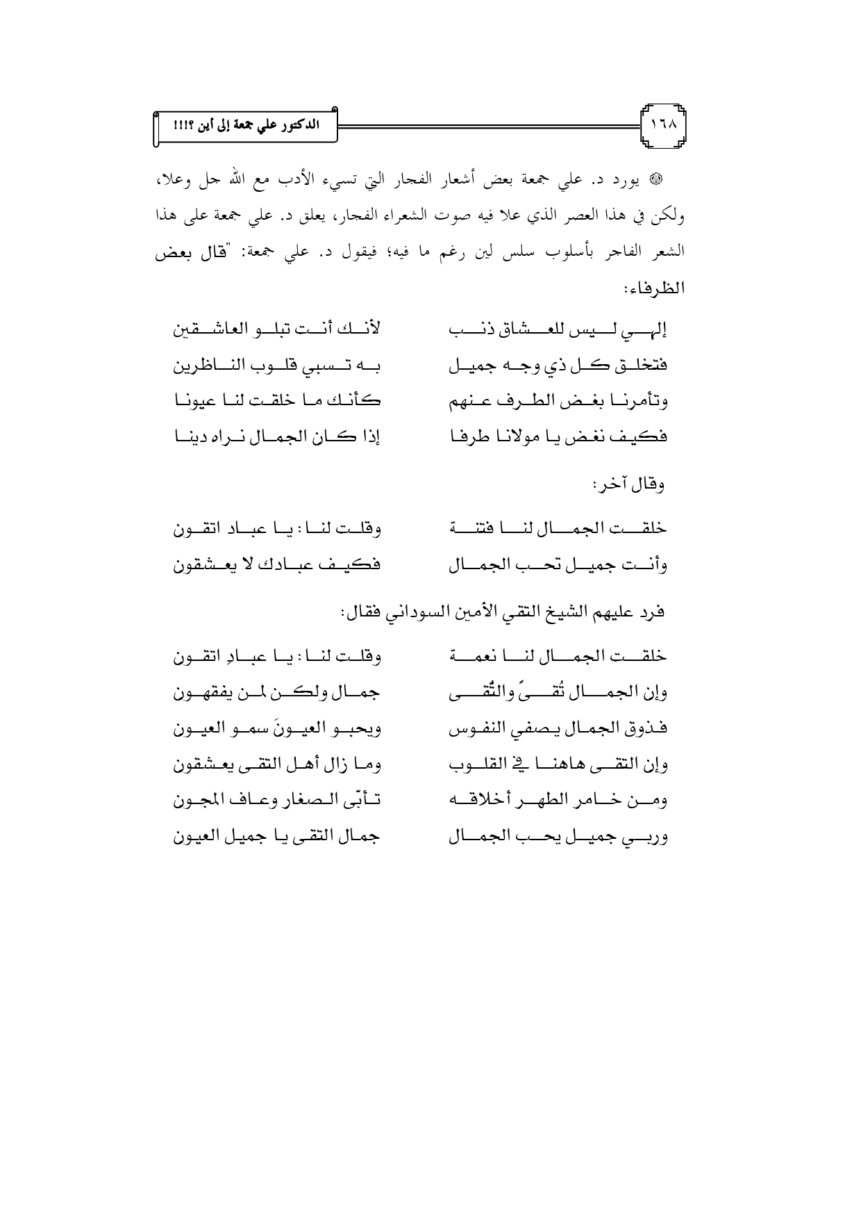 * يورد د. علي جمعة بعض أشعار الفجار التي تسيء الأدب مع الله جل وعلا، ولكن في هذا العصر الذي علا فيه صوت الشعراء الفجار، يعلق د. علي جمعة على هذا الشعر الفاجر بأسلوب سلس لين رغم ما فيه؛ فيقول د. علي جمعة: "قال بعض الظرفاء: