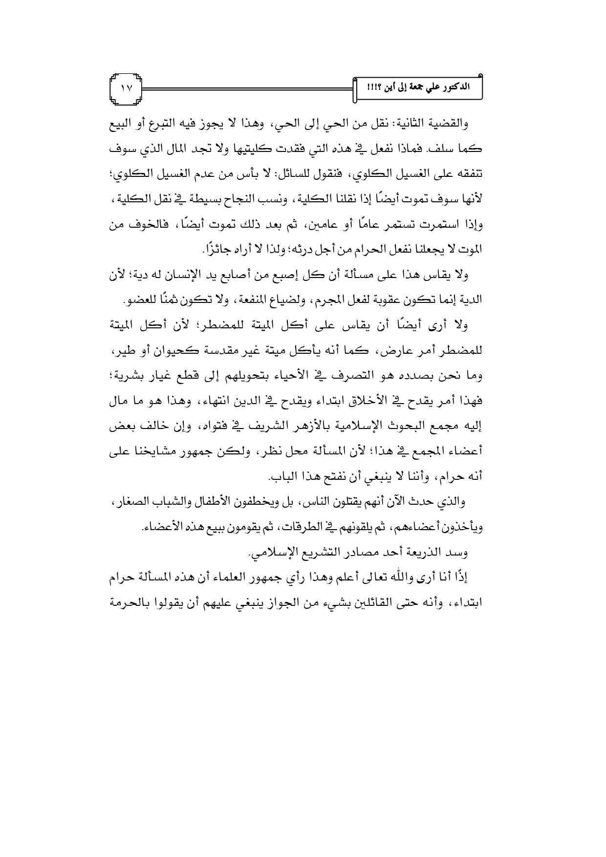 ولا أرى أيضًا أن يقاس على أكل الميتة للمضطر؛ لأن أكل الميتة للمضطر أمر عارض، كما أنه يأكل ميتة غير مقدسة كحيوان أو طير، وما نحن بصدده هو التصرف في الأحياء بتحويلهم إلى قطع غيار بشرية؛ فهذا أمر يقدح في الأخلاق ابتداء ويقدح في الدين انتهاء، وهذا هو ما مال إليه مجمع البحوث الإسلامية بالأزهر الشريف في فتواه، وإن خالف بعض أعضاء المجمع في هذا؛ لأن المسألة محل نظر، ولكن جمهور مشايخنا على أنه حرام، وأننا لا ينبغي أن نفتح هذا الباب.