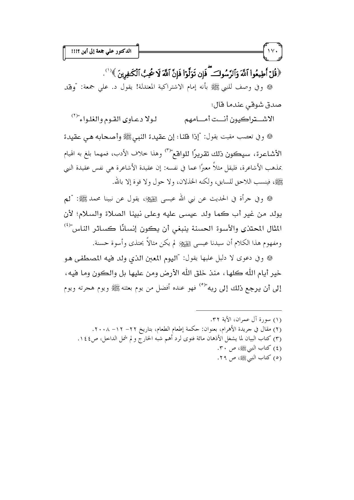 * وفي جرأة في الحديث عن نبي الله عيسى عليه السلام، يقول عن نبينا محمد صلى الله عليه وسلم: "لم يولد من غير أب كما ولد عيسى عليه وعلى نبينا الصلاة والسلام؛ لأن المثال المحتذى والأسوة الحسنة ينبغي أن يكون إنسانًا كسائر الناس" (¬4) ومفهوم هذا الكلام أن سيدنا عيسى عليه السلام لم يكن مثالاً يحتذى وأسوة حسنة.