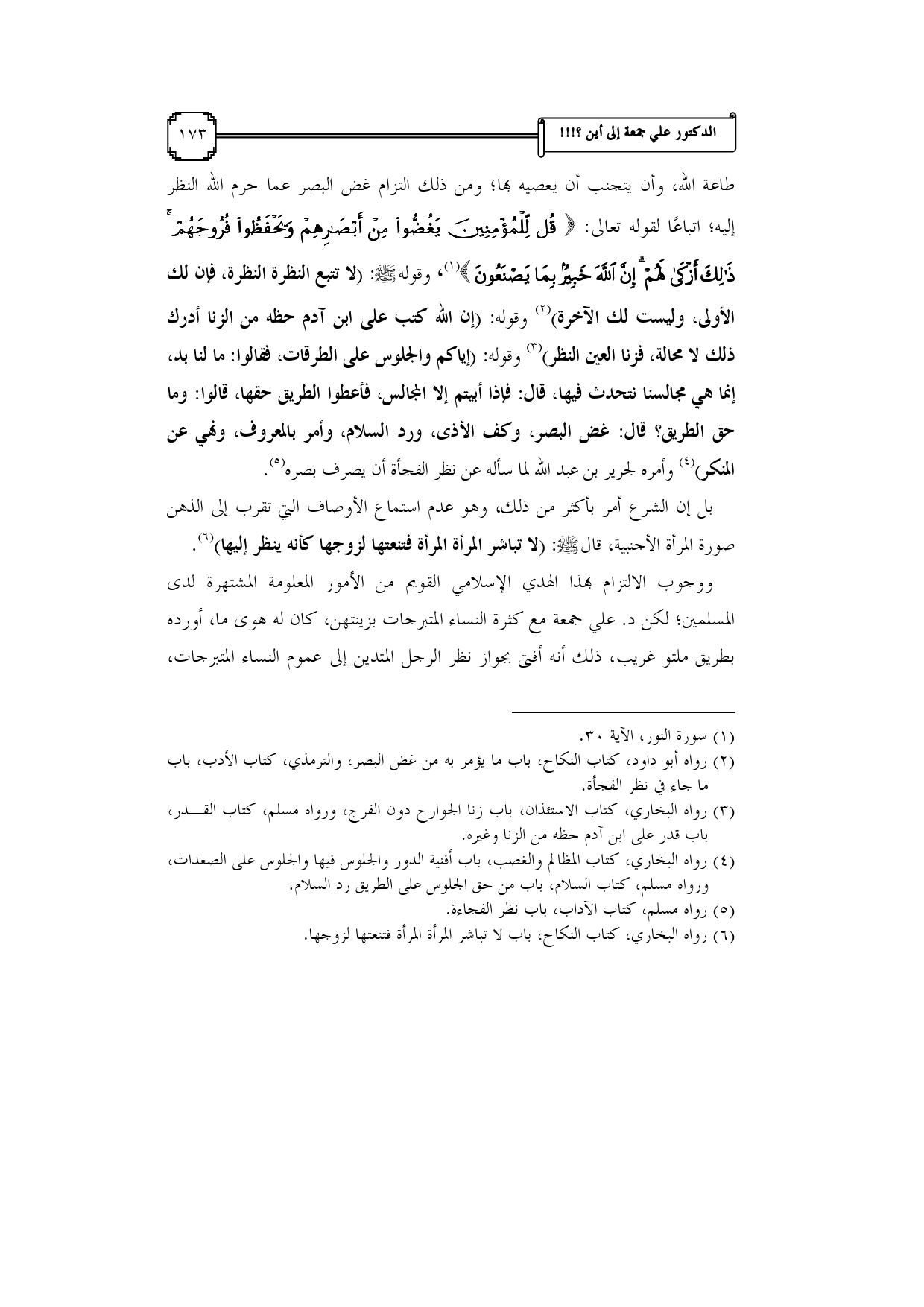 ووجوب الالتزام بهذا الهدي الإسلامي القويم من الأمور المعلومة المشتهرة لدى المسلمين؛ لكن د. علي جمعة مع كثرة النساء المتبرجات بزينتهن، كان له هوى ما، أورده بطريق ملتو غريب، ذلك أنه أفتى بجواز نظر الرجل المتدين إلى عموم النساء المتبرجات،