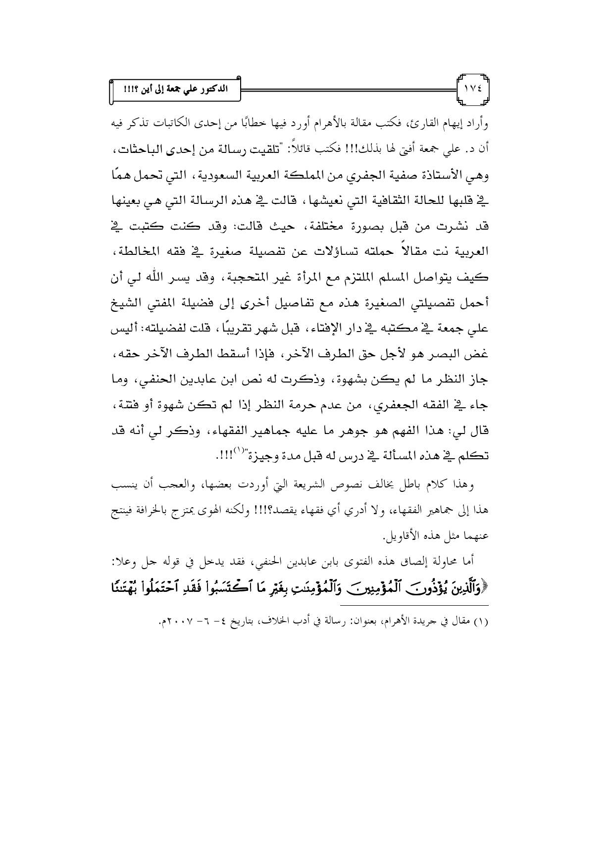 أما محاولة إلصاق هذه الفتوى بابن عابدين الحنفي، فقد يدخل في قوله جل وعلا: {وَالَّذِينَ يُؤْذُونَ الْمُؤْمِنِينَ وَالْمُؤْمِنَاتِ بِغَيْرِ مَا اكْتَسَبُوا فَقَدِ احْتَمَلُوا بُهْتَانًا