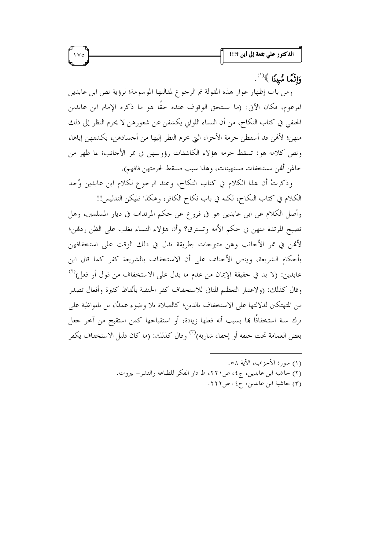 وأصل الكلام عن ابن عابدين هو في فروع عن حكم المرتدات في ديار المسلمين، وهل تصبح المرتدة منهن في حكم الأمة وتسترق؟ وأن هؤلاء النساء يغلب على الظن ردتهن؛ لأنهن في ممر الأجانب وهن متبرجات بطريقة تدل في ذلك الوقت على استخفافهن بأحكام الشريعة، وينص الأحناف على أن الاستخفاف بالشريعة كفر كما قال ابن عابدين: (لا بد في حقيقة الإيمان من عدم ما يدل على الاستخفاف من قول أو فعل) (¬2) وقال كذلك: (ولاعتبار التعظيم المنافي للاستخفاف كفر الحنفية بألفاظ كثيرة وأفعال تصدر من المتهتكين لدلالتها على الاستخفاف بالدين؛ كالصلاة بلا وضوء عمدًا، بل بالمواظبة على ترك سنة استخفافًا بها بسبب أنه فعلها زيادة، أو استقباحها كمن استقبح من آخر جعل بعض العمامة تحت حلقه أو إحفاء شاربه) (¬3) وقال كذلك: (ما كان دليل الاستخفاف يكفر