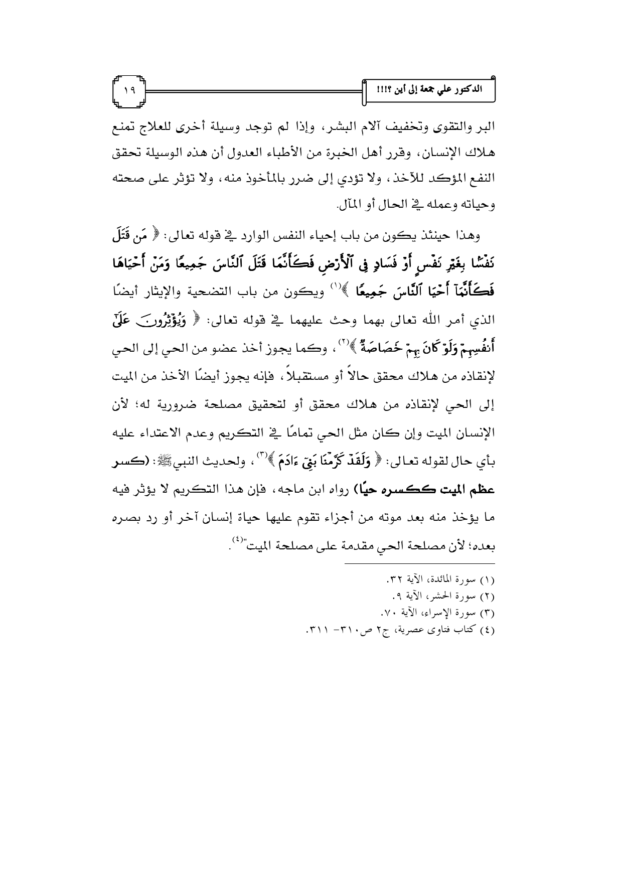 وهذا حينئذ يكون من باب إحياء النفس الوارد في قوله تعالى: {مَنْ قَتَلَ نَفْسًا بِغَيْرِ نَفْسٍ أَوْ فَسَادٍ فِي الْأَرْضِ فَكَأَنَّمَا قَتَلَ النَّاسَ جَمِيعًا وَمَنْ أَحْيَاهَا فَكَأَنَّمَا أَحْيَا النَّاسَ جَمِيعًا} (¬1) ويكون من باب التضحية والإيثار أيضًا الذي أمر الله تعالى بهما وحث عليهما في قوله تعالى: {وَيُؤْثِرُونَ عَلَى أَنْفُسِهِمْ وَلَوْ كَانَ بِهِمْ خَصَاصَةٌ} (¬2)، وكما يجوز أخذ عضو من الحي إلى الحي لإنقاذه من هلاك محقق حالاً أو مستقبلاً، فإنه يجوز أيضًا الأخذ من الميت إلى الحي لإنقاذه من هلاك محقق أو لتحقيق مصلحة ضرورية له؛ لأن الإنسان الميت وإن كان مثل الحي تمامًا في التكريم وعدم الاعتداء عليه بأي حال لقوله تعالى: {وَلَقَدْ كَرَّمْنَا بَنِي آدَمَ} (¬3)، ولحديث النبي صلى الله عليه وسلم: (كسر عظم الميت ككسره حيًا) رواه ابن ماجه، فإن هذا التكريم لا يؤثر فيه ما يؤخذ منه بعد موته من أجزاء تقوم عليها حياة إنسان آخر أو رد بصره بعده؛ لأن مصلحة الحي مقدمة على مصلحة الميت" (¬4).
