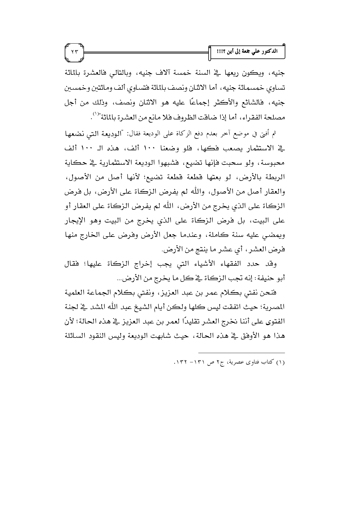 جنيه، ويكون ريعها في السنة خمسة آلاف جنيه، وبالتالي فالعشرة بالمائة تساوي خمسمائة جنيه، أما الاثنان ونصف بالمائة فتساوي ألف ومائتين وخمسين جنيه، فالشائع والأكثر إجماعًا عليه هو الاثنان ونصف، وذلك من أجل مصلحة الفقراء، أما إذا ضاقت الظروف فلا مانع من العشرة بالمائة" (¬1).