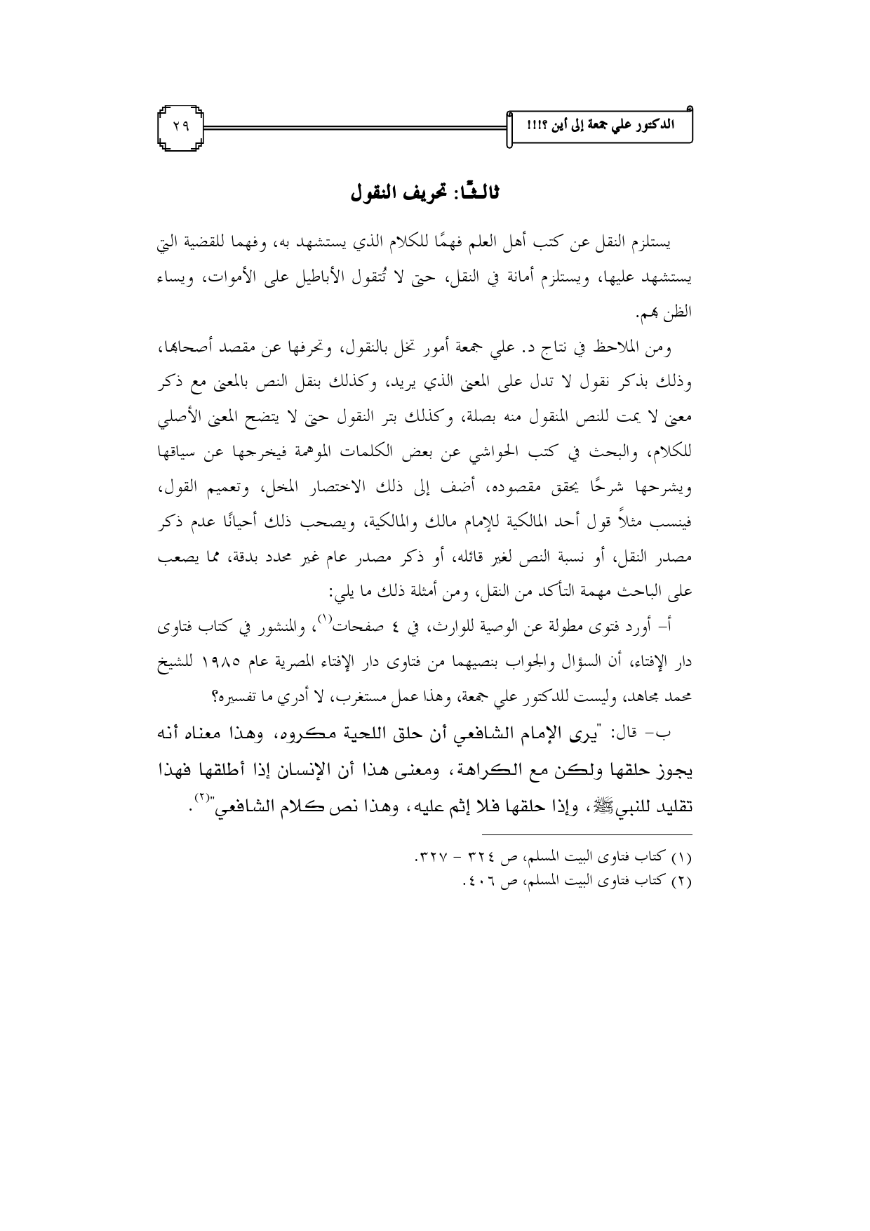 ومن الملاحظ في نتاج د. علي جمعة أمور تخل بالنقول، وتحرفها عن مقصد أصحابها، وذلك بذكر نقول لا تدل على المعنى الذي يريد، وكذلك بنقل النص بالمعنى مع ذكر معنى لا يمت للنص المنقول منه بصلة، وكذلك بتر النقول حتى لا يتضح المعنى الأصلي للكلام، والبحث في كتب الحواشي عن بعض الكلمات الموهمة فيخرجها عن سياقها ويشرحها شرحًا يحقق مقصوده، أضف إلى ذلك الاختصار المخل، وتعميم القول، فينسب مثلاً قول أحد المالكية للإمام مالك والمالكية، ويصحب ذلك أحيانًا عدم ذكر مصدر النقل، أو نسبة النص لغير قائله، أو ذكر مصدر عام غير محدد بدقة، مما يصعب على الباحث مهمة التأكد من النقل، ومن أمثلة ذلك ما يلي: