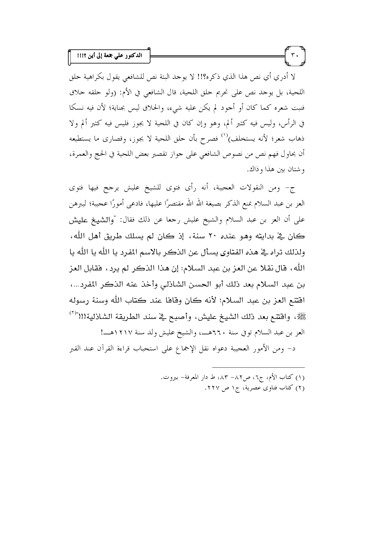 ج- ومن النقولات العجيبة، أنه رأى فتوى للشيخ عليش يرجح فيها فتوى العز بن عبد السلام بمنع الذكر بصيغة الله الله مقتصرًا عليها، فادعى أمورًا عجيبة؛ ليبرهن على أن العز بن عبد السلام والشيخ عليش رجعا عن ذلك فقال: "والشيخ عليش كان في بدايته وهو عنده 20 سنة، إذ كان لم يسلك طريق أهل الله، ولذلك تراه في هذه الفتاوى يسأل عن الذكر بالاسم المفرد يا الله يا الله يا الله، قال نقلا عن العز بن عبد السلام: إن هذا الذكر لم يرد، فقابل العز بن عبد السلام بعد ذلك أبو الحسن الشاذلي وأخذ عنه الذكر المفرد ... ، اقتنع العز بن عبد السلام؛ لأنه كان وقافا عند كتاب الله وسنة رسوله صلى الله عليه وسلم، واقتنع بعد ذلك الشيخ عليش، وأصبح في سند الطريقة الشاذلية!!! " (¬2) العز بن عبد السلام توفي سنة 660هـ، والشيخ عليش ولد سنة 1217هـ!