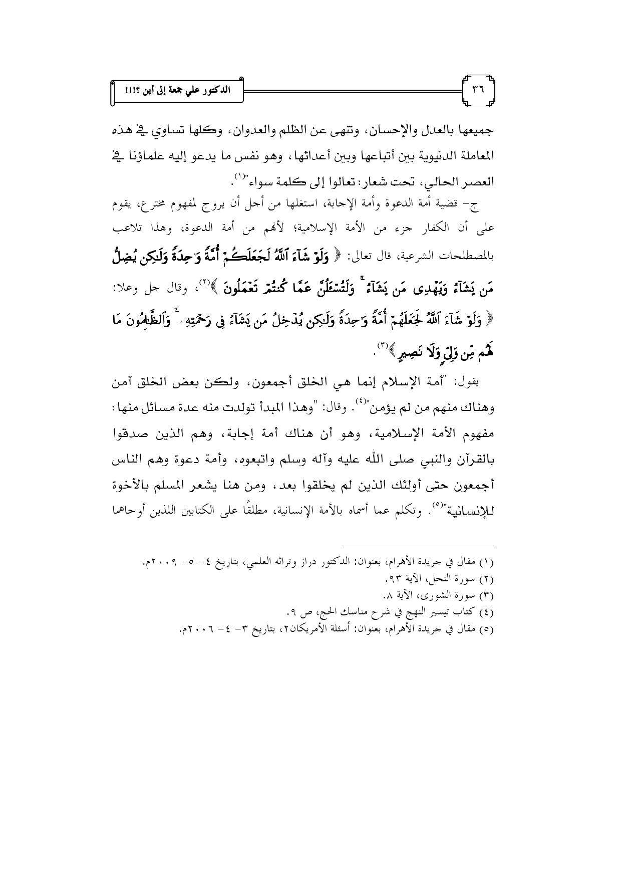 ج- قضية أمة الدعوة وأمة الإجابة، استغلها من أجل أن يروج لمفهوم مخترع، يقوم على أن الكفار جزء من الأمة الإسلامية؛ لأنهم من أمة الدعوة، وهذا تلاعب بالمصطلحات الشرعية، قال تعالى: {وَلَوْ شَاءَ اللَّهُ لَجَعَلَكُمْ أُمَّةً وَاحِدَةً وَلَكِنْ يُضِلُّ مَنْ يَشَاءُ وَيَهْدِي مَنْ يَشَاءُ وَلَتُسْأَلُنَّ عَمَّا كُنْتُمْ تَعْمَلُونَ} (¬2)، وقال جل وعلا: {وَلَوْ شَاءَ اللَّهُ لَجَعَلَهُمْ أُمَّةً وَاحِدَةً وَلَكِنْ يُدْخِلُ مَنْ يَشَاءُ فِي رَحْمَتِهِ وَالظَّالِمُونَ مَا لَهُمْ مِنْ وَلِيٍّ وَلَا نَصِيرٍ} (¬3).