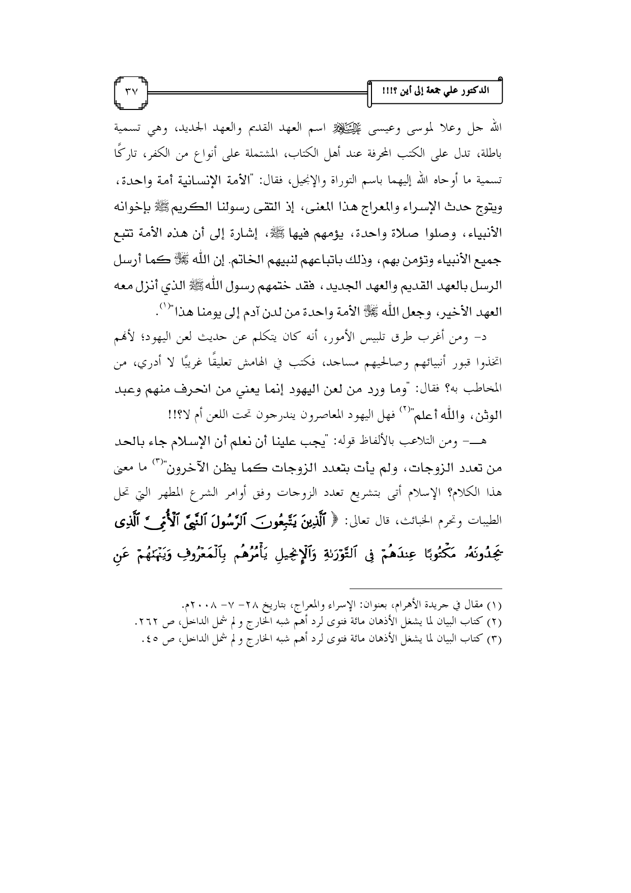هـ- ومن التلاعب بالألفاظ قوله: "يجب علينا أن نعلم أن الإسلام جاء بالحد من تعدد الزوجات، ولم يأت بتعدد الزوجات كما يظن الآخرون" (¬3) ما معنى هذا الكلام؟ الإسلام أتى بتشريع تعدد الزوجات وفق أوامر الشرع المطهر التي تحل الطيبات وتحرم الخبائث، قال تعالى: {الَّذِينَ يَتَّبِعُونَ الرَّسُولَ النَّبِيَّ الْأُمِّيَّ الَّذِي يَجِدُونَهُ مَكْتُوبًا عِنْدَهُمْ فِي التَّوْرَاةِ وَالْإِنْجِيلِ يَأْمُرُهُمْ بِالْمَعْرُوفِ وَيَنْهَاهُمْ عَنِ