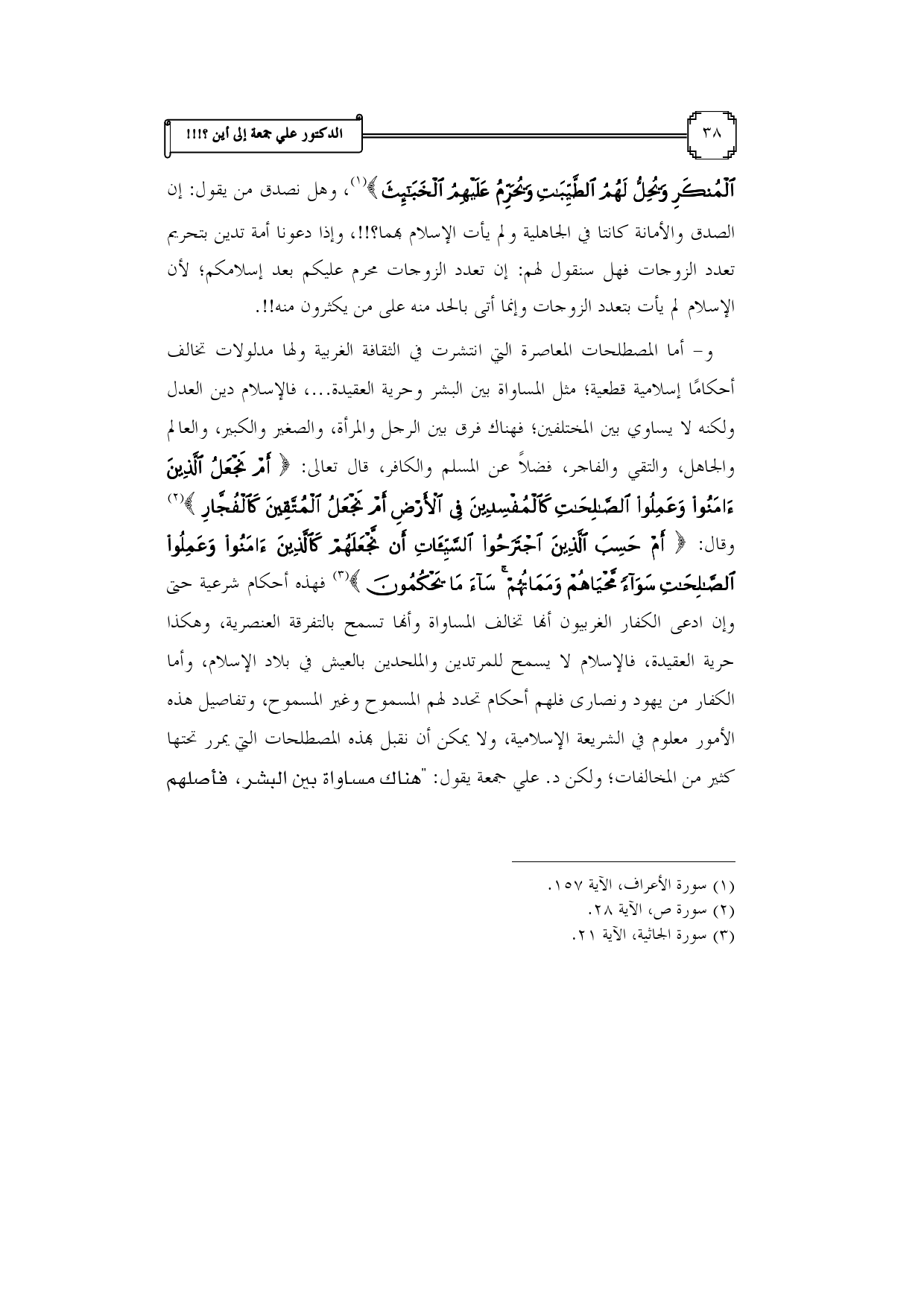 وأما المصطلحات المعاصرة التي انتشرت في الثقافة الغربية ولها مدلولات تخالف أحكامًا إسلامية قطعية؛ مثل المساواة بين البشر وحرية العقيدة ... ، فالإسلام دين العدل ولكنه لا يساوي بين المختلفين؛ فهناك فرق بين الرجل والمرأة، والصغير والكبير، والعالم والجاهل، والتقي والفاجر، فضلاً عن المسلم والكافر، قال تعالى: {أَمْ نَجْعَلُ الَّذِينَ آمَنُوا وَعَمِلُوا الصَّالِحَاتِ كَالْمُفْسِدِينَ فِي الْأَرْضِ أَمْ نَجْعَلُ الْمُتَّقِينَ كَالْفُجَّارِ} (¬2) وقال: {أَمْ حَسِبَ الَّذِينَ اجْتَرَحُوا السَّيِّئَاتِ أَنْ نَجْعَلَهُمْ كَالَّذِينَ آمَنُوا وَعَمِلُوا الصَّالِحَاتِ سَوَاءً مَحْيَاهُمْ وَمَمَاتُهُمْ سَاءَ مَا يَحْكُمُونَ} (¬3) فهذه أحكام شرعية حتى وإن ادعى الكفار الغربيون أنها تخالف المساواة وأنها تسمح بالتفرقة العنصرية، وهكذا حرية العقيدة، فالإسلام لا يسمح للمرتدين والملحدين بالعيش في بلاد الإسلام، وأما الكفار من يهود ونصارى فلهم أحكام تحدد لهم المسموح وغير المسموح، وتفاصيل هذه الأمور معلوم في الشريعة الإسلامية، ولا يمكن أن نقبل بهذه المصطلحات التي يمرر تحتها كثير من المخالفات؛ ولكن د. علي جمعة يقول: "هناك مساواة بين البشر، فأصلهم