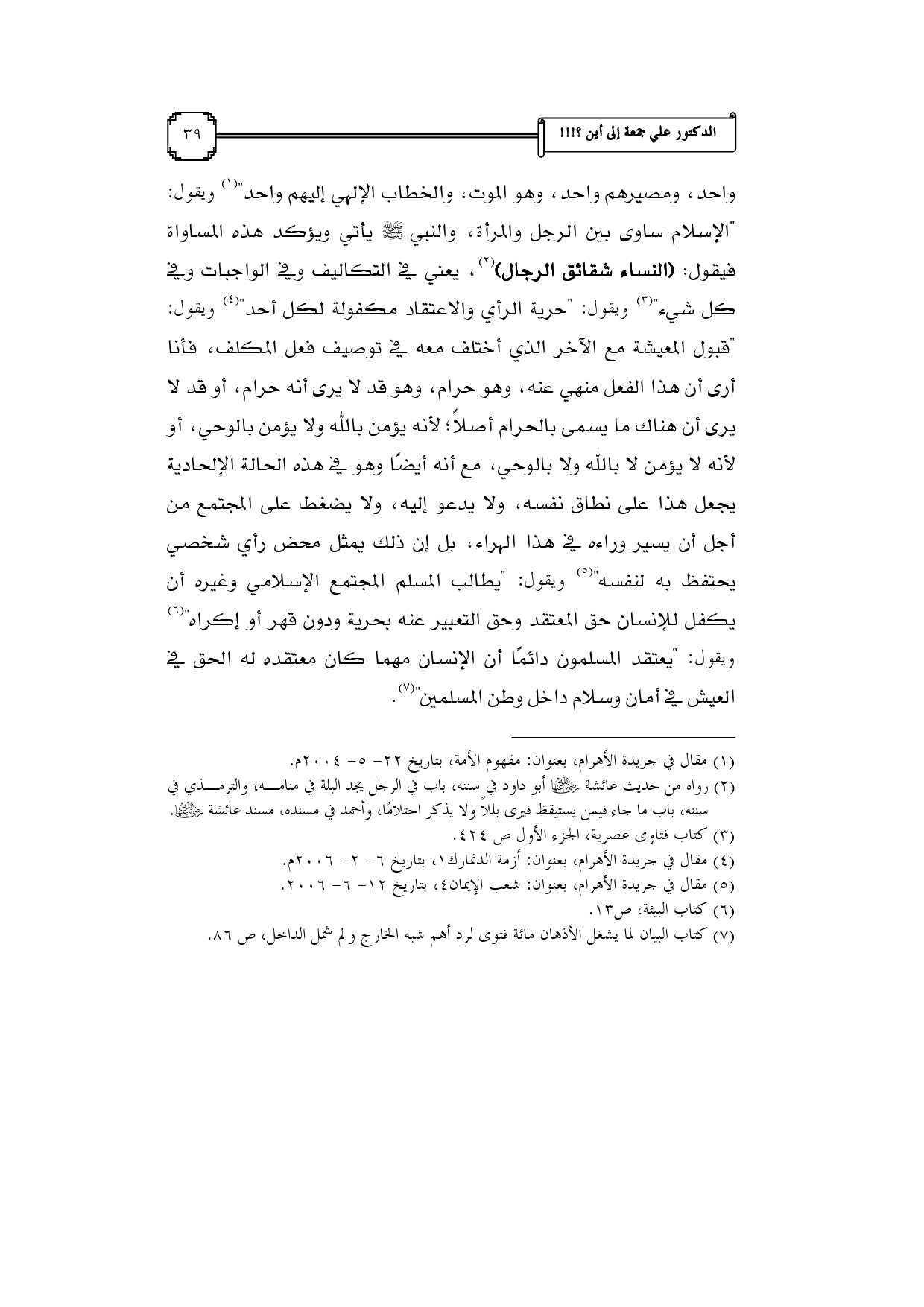 واحد، ومصيرهم واحد، وهو الموت، والخطاب الإلهي إليهم واحد" (¬1) ويقول: "الإسلام ساوى بين الرجل والمرأة، والنبي صلى الله عليه وسلم يأتي ويؤكد هذه المساواة فيقول: (النساء شقائق الرجال) (¬2)، يعني في التكاليف وفي الواجبات وفي كل شيء" (¬3) ويقول: "حرية الرأي والاعتقاد مكفولة لكل أحد" (¬4) ويقول: "قبول المعيشة مع الآخر الذي أختلف معه في توصيف فعل المكلف، فأنا أرى أن هذا الفعل منهي عنه، وهو حرام، وهو قد لا يرى أنه حرام، أو قد لا يرى أن هناك ما يسمى بالحرام أصلاً؛ لأنه يؤمن بالله ولا يؤمن بالوحي، أو لأنه لا يؤمن لا بالله ولا بالوحي، مع أنه أيضًا وهو في هذه الحالة الإلحادية يجعل هذا على نطاق نفسه، ولا يدعو إليه، ولا يضغط على المجتمع من أجل أن يسير وراءه في هذا الهراء، بل إن ذلك يمثل محض رأي شخصي يحتفظ به لنفسه" (¬5) ويقول: "يطالب المسلم المجتمع الإسلامي وغيره أن يكفل للإنسان حق المعتقد وحق التعبير عنه بحرية ودون قهر أو إكراه" (¬6) ويقول: "يعتقد المسلمون دائمًا أن الإنسان مهما كان معتقده له الحق في العيش في أمان وسلام داخل وطن المسلمين" (¬7).