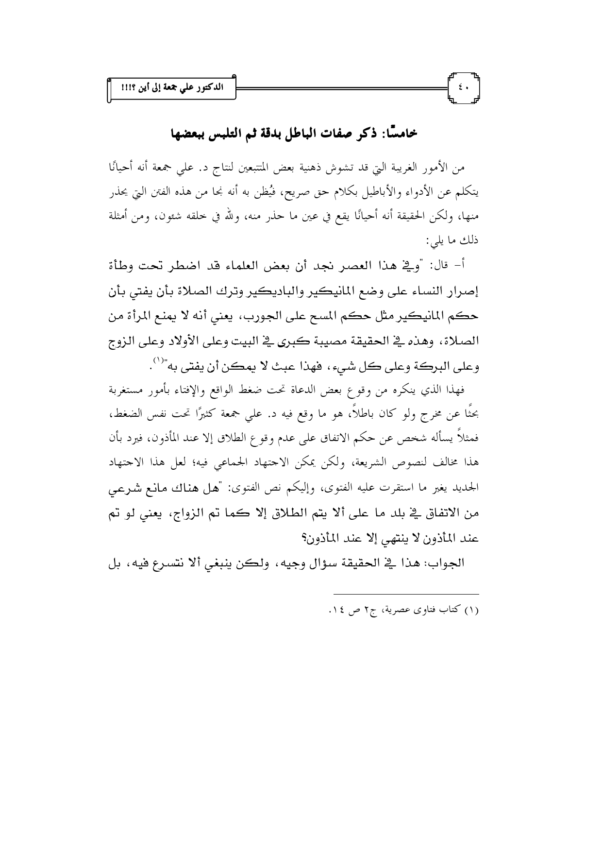 أ- قال: "وفي هذا العصر نجد أن بعض العلماء قد اضطر تحت وطأة إصرار النساء على وضع المانيكير والباديكير وترك الصلاة بأن يفتي بأن حكم المانيكير مثل حكم المسح على الجورب، يعني أنه لا يمنع المرأة من الصلاة، وهذه في الحقيقة مصيبة كبرى في البيت وعلى الأولاد وعلى الزوج وعلى البركة وعلى كل شيء، فهذا عبث لا يمكن أن يفتى به" (¬1).