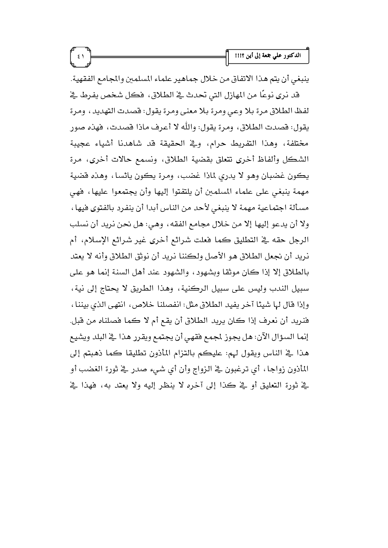 قد نرى نوعًا من المهازل التي تحدث في الطلاق، فكل شخص يفرط في لفظ الطلاق مرة بلا وعي ومرة بلا معنى ومرة يقول: قصدت التهديد، ومرة يقول: قصدت الطلاق، ومرة يقول: والله لا أعرف ماذا قصدت، فهذه صور مختلفة، وهذا التفريط حرام، وفي الحقيقة قد شاهدنا أشياء عجيبة الشكل وألفاظ أخرى تتعلق بقضية الطلاق، ونسمع حالات أخرى، مرة يكون غضبان وهو لا يدري لماذا غضب، ومرة يكون يائسا، وهذه قضية مهمة ينبغي على علماء المسلمين أن يلتفتوا إليها وأن يجتمعوا عليها، فهي مسألة اجتماعية مهمة لا ينبغي لأحد من الناس أبدا أن ينفرد بالفتوى فيها، ولا أن يدعو إليها إلا من خلال مجامع الفقه، وهي: هل نحن نريد أن نسلب الرجل حقه في التطليق كما فعلت شرائع أخرى غير شرائع الإسلام، أم نريد أن نجعل الطلاق هو الأصل ولكننا نريد أن نوثق الطلاق وأنه لا يعتد بالطلاق إلا إذا كان موثقا وبشهود، والشهود عند أهل السنة إنما هو على سبيل الندب وليس على سبيل الركنية، وهذا الطريق لا يحتاج إلى نية، وإذا قال لها شيئا آخر يفيد الطلاق مثل: انفصلنا خلاص، انتهى الذي بيننا، فنريد أن نعرف إذا كان يريد الطلاق أن يقع أم لا كما فصلناه من قبل. إنما السؤال الآن: هل يجوز لمجمع فقهي أن يجتمع ويقرر هذا في البلد ويشيع هذا في الناس ويقول لهم: عليكم بالتزام المأذون تطليقا كما ذهبتم إلى المأذون زواجا، أي ترغبون في الزواج وأن أي شيء صدر في ثورة الغضب أو في ثورة التعليق أو في كذا إلى آخره لا ينظر إليه ولا يعتد به، فهذا في