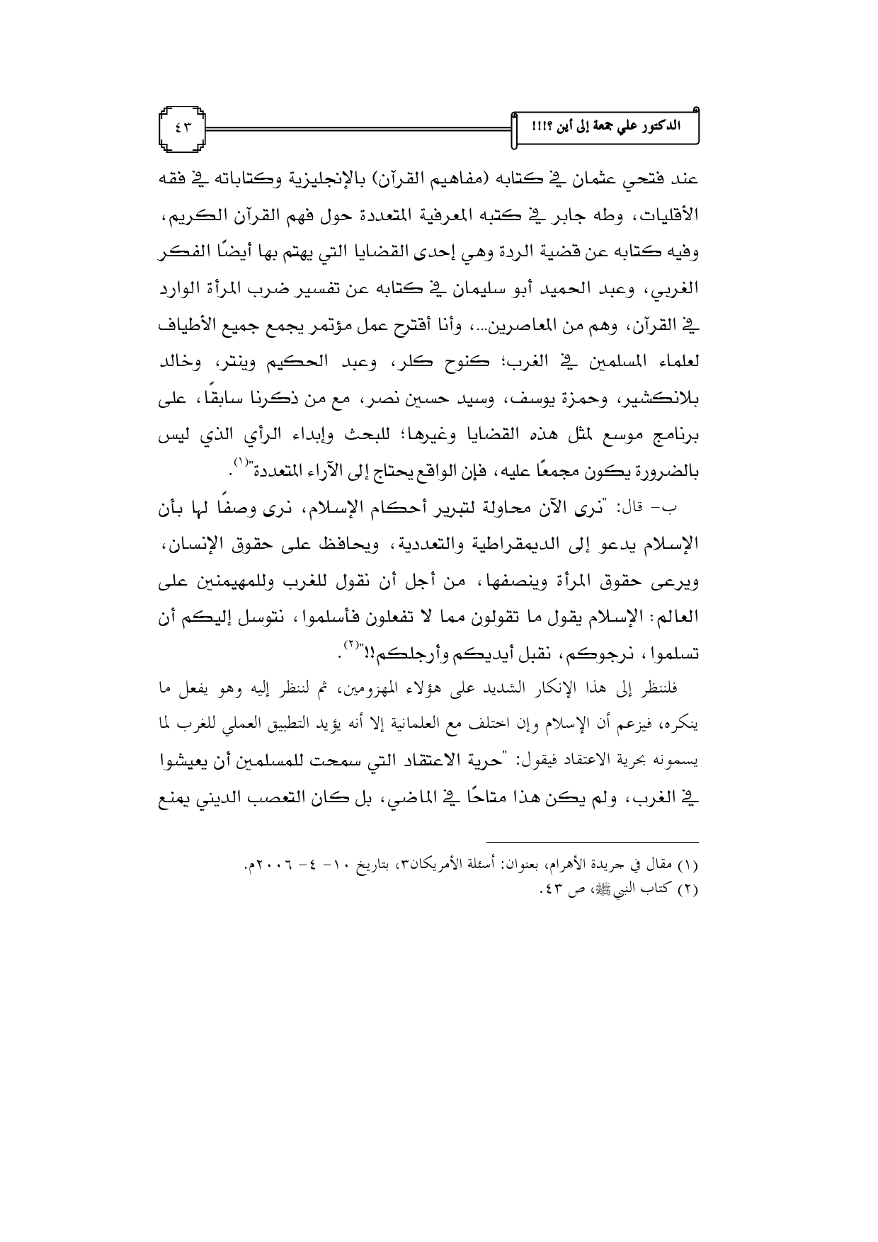 ب- قال: "نرى الآن محاولة لتبرير أحكام الإسلام، نرى وصفًا لها بأن الإسلام يدعو إلى الديمقراطية والتعددية، ويحافظ على حقوق الإنسان، ويرعى حقوق المرأة وينصفها، من أجل أن نقول للغرب وللمهيمنين على العالم: الإسلام يقول ما تقولون مما لا تفعلون فأسلموا، نتوسل إليكم أن تسلموا، نرجوكم، نقبل أيديكم وأرجلكم!! " (¬2).
