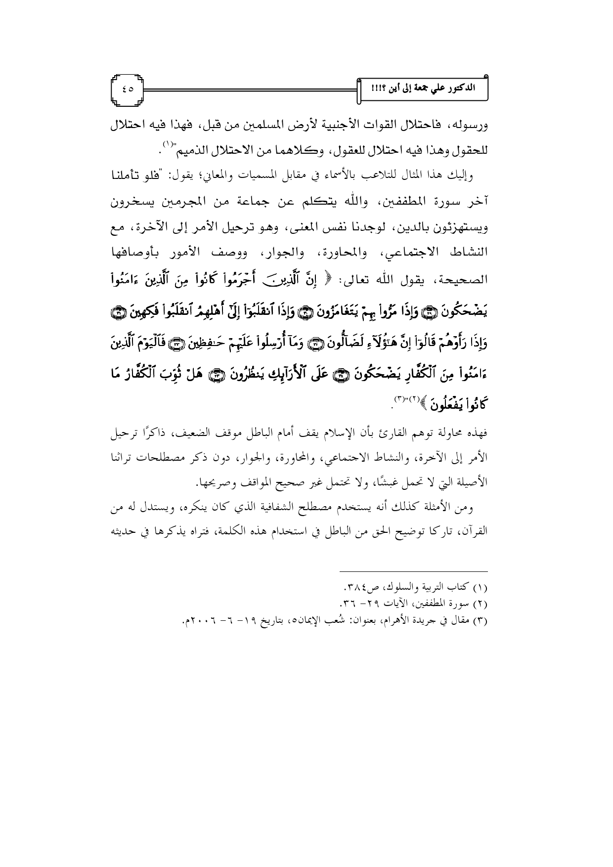 وإليك هذا المثال للتلاعب بالأسماء في مقابل المسميات والمعاني؛ يقول: "فلو تأملنا آخر سورة المطففين، والله يتكلم عن جماعة من المجرمين يسخرون ويستهزئون بالدين، لوجدنا نفس المعنى، وهو ترحيل الأمر إلى الآخرة، مع النشاط الاجتماعي، والمحاورة، والجوار، ووصف الأمور بأوصافها الصحيحة، يقول الله تعالى: {إِنَّ الَّذِينَ أَجْرَمُوا كَانُوا مِنَ الَّذِينَ آمَنُوا يَضْحَكُونَ وَإِذَا مَرُّوا بِهِمْ يَتَغَامَزُونَ وَإِذَا انْقَلَبُوا إِلَى أَهْلِهِمُ انْقَلَبُوا فَكِهِينَ وَإِذَا رَأَوْهُمْ قَالُوا إِنَّ هَؤُلَاءِ لَضَالُّونَ وَمَا أُرْسِلُوا عَلَيْهِمْ حَافِظِينَ فَالْيَوْمَ الَّذِينَ آمَنُوا مِنَ الْكُفَّارِ يَضْحَكُونَ عَلَى الْأَرَائِكِ يَنْظُرُونَ هَلْ ثُوِّبَ الْكُفَّارُ مَا كَانُوا يَفْعَلُونَ} (¬2) " (¬3). فهذه محاولة توهم القارئ بأن الإسلام يقف أمام الباطل موقف الضعيف، ذاكرًا ترحيل الأمر إلى الآخرة، والنشاط الاجتماعي، والمحاورة، والجوار، دون ذكر مصطلحات تراثنا الأصيلة التي لا تحمل غبشًا، ولا تحتمل غير صحيح المواقف وصريحها.