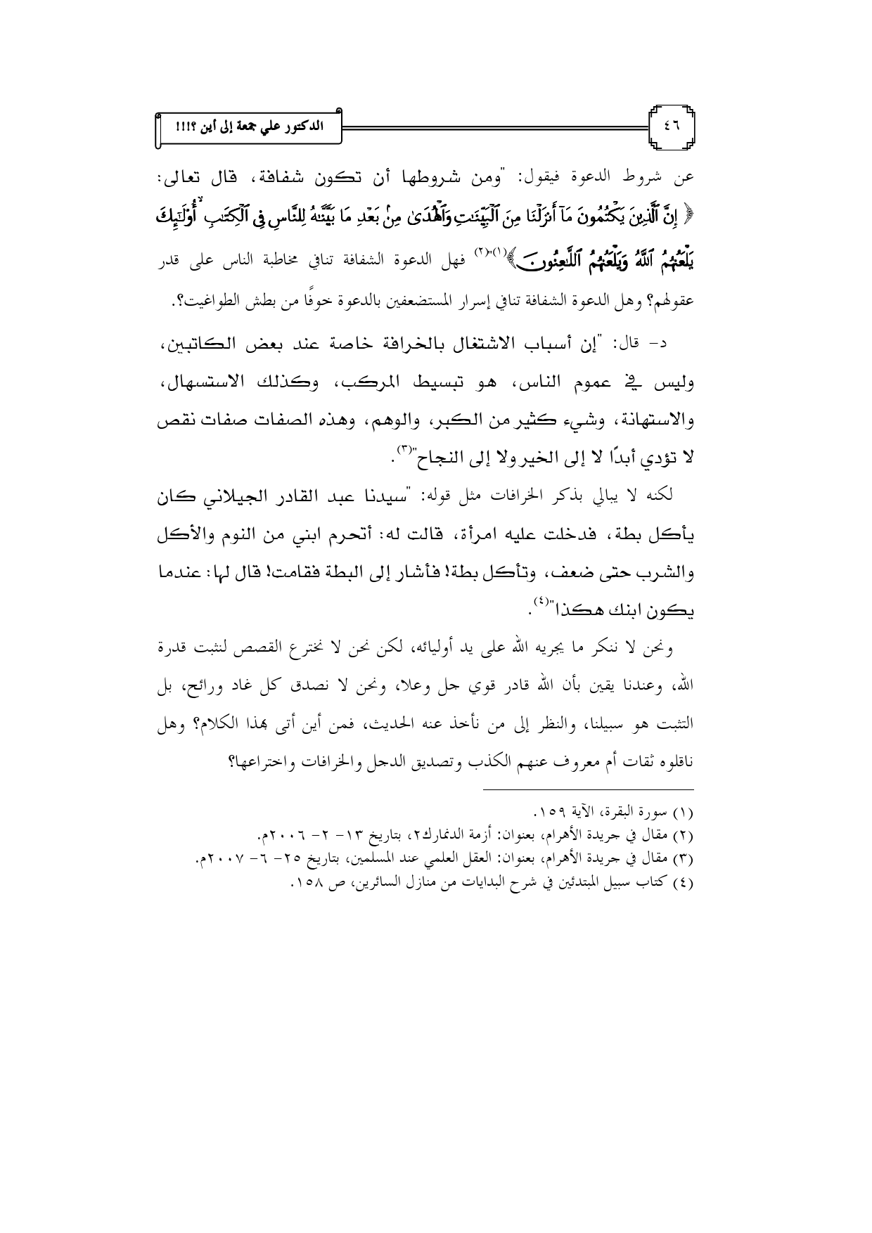 لكنه لا يبالي بذكر الخرافات مثل قوله: "سيدنا عبد القادر الجيلاني كان يأكل بطة، فدخلت عليه امرأة، قالت له: أتحرم ابني من النوم والأكل والشرب حتى ضعف، وتأكل بطة! فأشار إلى البطة فقامت! قال لها: عندما يكون ابنك هكذا" (¬4).