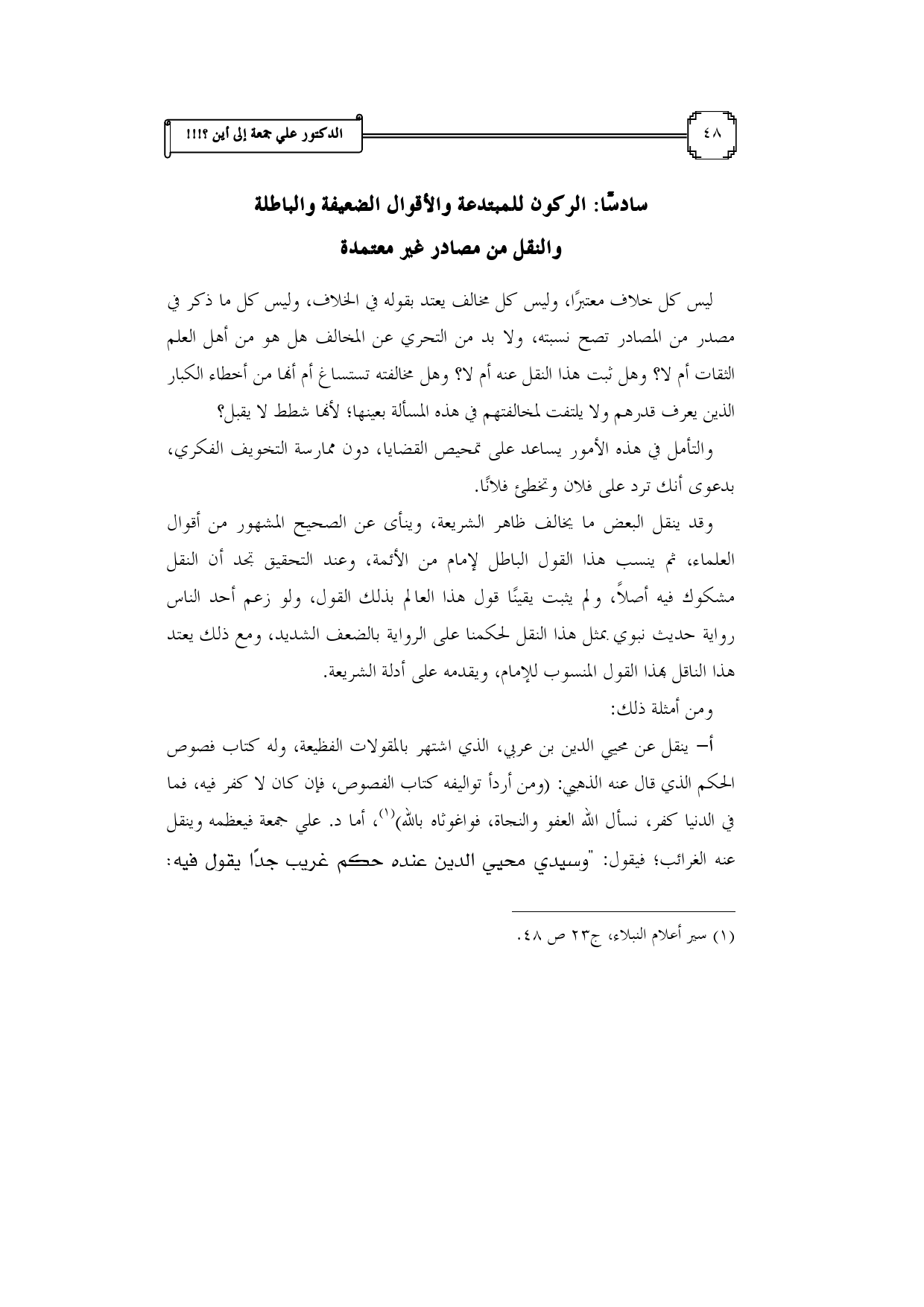 وقد ينقل البعض ما يخالف ظاهر الشريعة، وينأى عن الصحيح المشهور من أقوال العلماء، ثم ينسب هذا القول الباطل لإمام من الأئمة، وعند التحقيق تجد أن النقل مشكوك فيه أصلاً، ولم يثبت يقينًا قول هذا العالم بذلك القول، ولو زعم أحد الناس رواية حديث نبوي بمثل هذا النقل لحكمنا على الرواية بالضعف الشديد، ومع ذلك يعتد هذا الناقل بهذا القول المنسوب للإمام، ويقدمه على أدلة الشريعة.