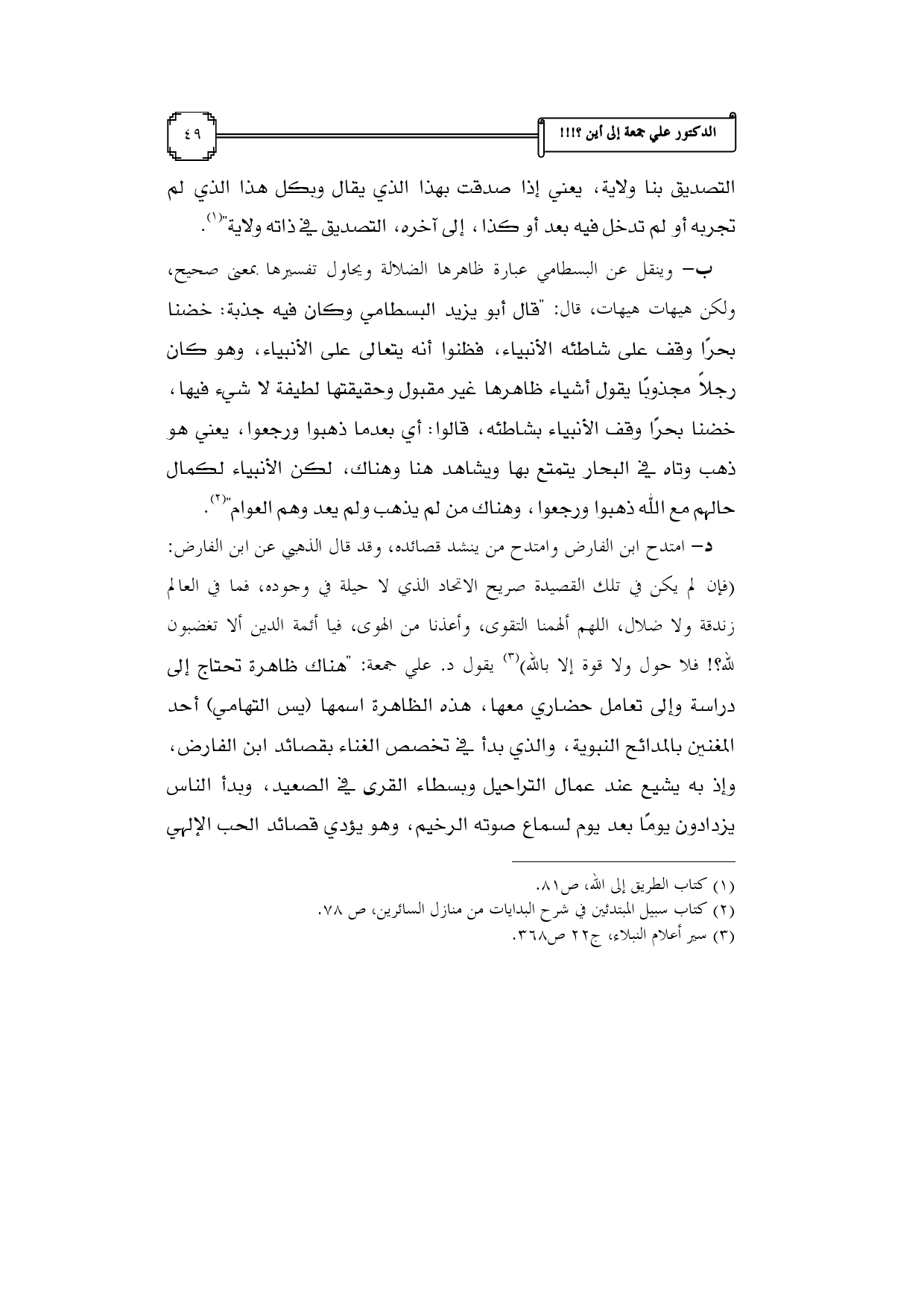 ب- وينقل عن البسطامي عبارة ظاهرها الضلالة ويحاول تفسيرها بمعنى صحيح، ولكن هيهات هيهات، قال: "قال أبو يزيد البسطامي وكان فيه جذبة: خضنا بحرًا وقف على شاطئه الأنبياء، فظنوا أنه يتعالى على الأنبياء، وهو كان رجلاً مجذوبًا يقول أشياء ظاهرها غير مقبول وحقيقتها لطيفة لا شيء فيها، خضنا بحرًا وقف الأنبياء بشاطئه، قالوا: أي بعدما ذهبوا ورجعوا، يعني هو ذهب وتاه في البحار يتمتع بها ويشاهد هنا وهناك، لكن الأنبياء لكمال حالهم مع الله ذهبوا ورجعوا، وهناك من لم يذهب ولم يعد وهم العوام" (¬2).