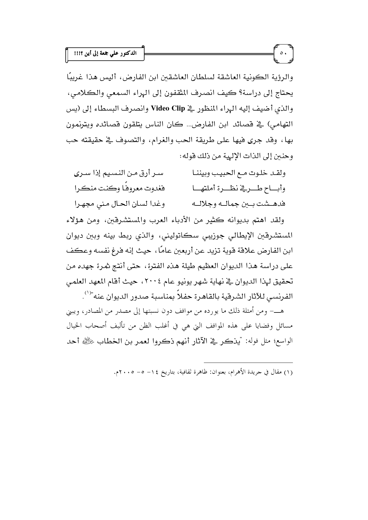 والرؤية الكونية العاشقة لسلطان العاشقين ابن الفارض، أليس هذا غريبًا يحتاج إلى دراسة؟ كيف انصرف المثقفون إلى الهراء السمعي والكلامي، والذي أضيف إليه الهراء المنظور في Video Clip وانصرف البسطاء إلى (يس التهامي) في قصائد ابن الفارض ... كان الناس يتلقون قصائده ويترنمون بها، وقد جرى فيها على طريقة الحب والغرام، والتصوف في حقيقته حب وحنين إلى الذات الإلهية من ذلك قوله: