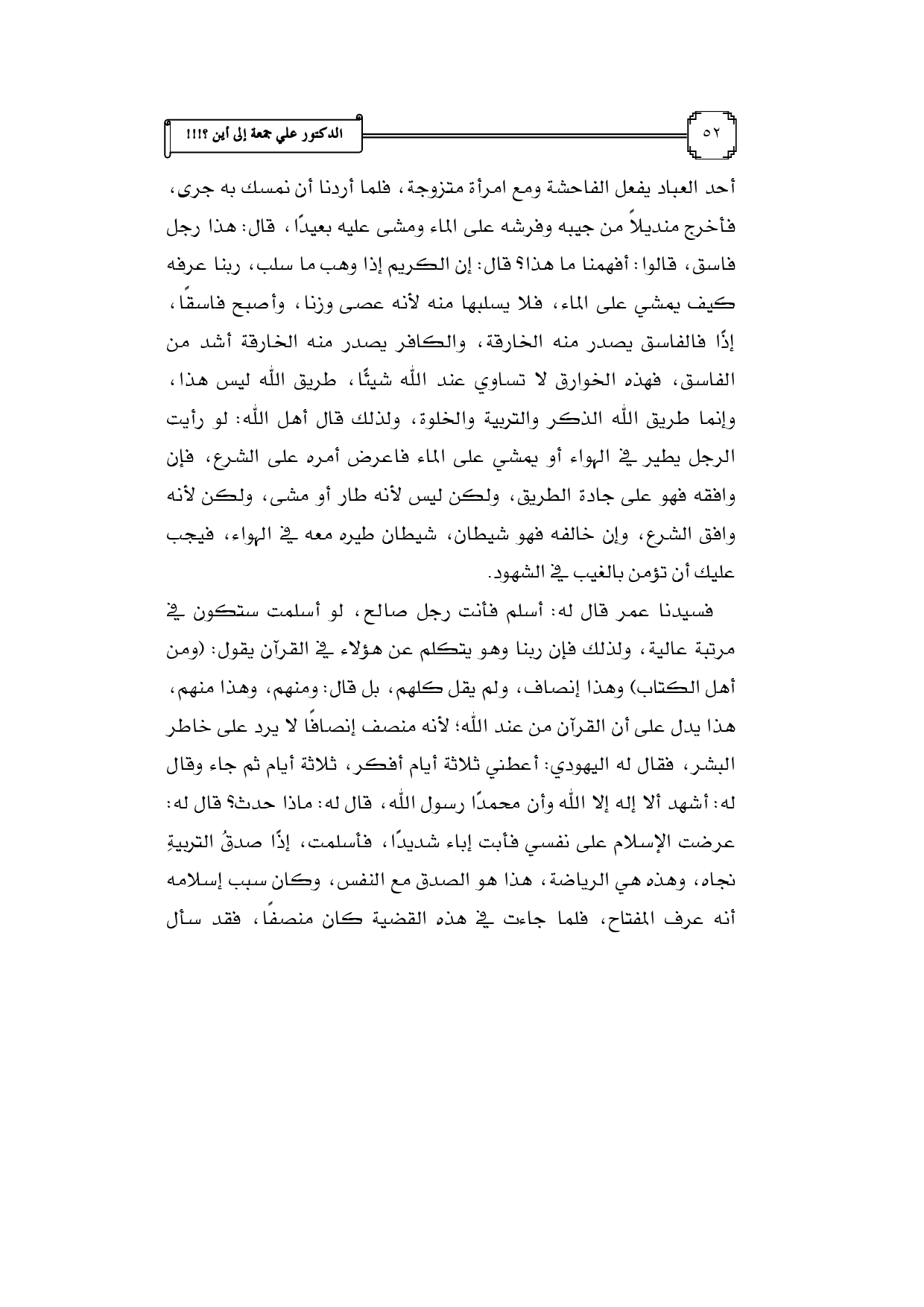 فسيدنا عمر قال له: أسلم فأنت رجل صالح، لو أسلمت ستكون في مرتبة عالية، ولذلك فإن ربنا وهو يتكلم عن هؤلاء في القرآن يقول: (ومن أهل الكتاب) وهذا إنصاف، ولم يقل كلهم، بل قال: ومنهم، وهذا منهم، هذا يدل على أن القرآن من عند الله؛ لأنه منصف إنصافًا لا يرد على خاطر البشر، فقال له اليهودي: أعطني ثلاثة أيام أفكر، ثلاثة أيام ثم جاء وقال له: أشهد ألا إله إلا الله وأن محمدًا رسول الله، قال له: ماذا حدث؟ قال له: عرضت الإسلام على نفسي فأبت إباء شديدًا، فأسلمت، إذًا صدقُ التربيةِ نجاه، وهذه هي الرياضة، هذا هو الصدق مع النفس، وكان سبب إسلامه أنه عرف المفتاح، فلما جاءت في هذه القضية كان منصفًا، فقد سأل