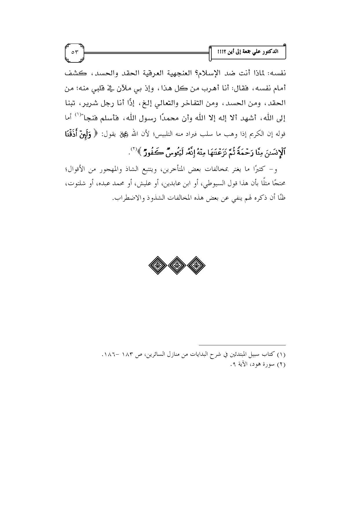 نفسه: لماذا أنت ضد الإسلام؟ العنجهية العرقية الحقد والحسد، كشف أمام نفسه، فقال: أنا أهرب من كل هذا، وإذ بي ملآن في قلبي منه؛ من الحقد، ومن الحسد، ومن التفاخر والتعالي إلخ، إذًا أنا رجل شرير، تبنا إلى الله، أشهد ألا إله إلا الله وأن محمدًا رسول الله، فأسلم فنجا" (¬1) أما قوله إن الكريم إذا وهب ما سلب فيراد منه التلبيس؛ لأن الله عز وجل يقول: {وَلَئِنْ أَذَقْنَا الْإِنْسَانَ مِنَّا رَحْمَةً ثُمَّ نَزَعْنَاهَا مِنْهُ إِنَّهُ لَيَئُوسٌ كَفُورٌ} (¬2).
