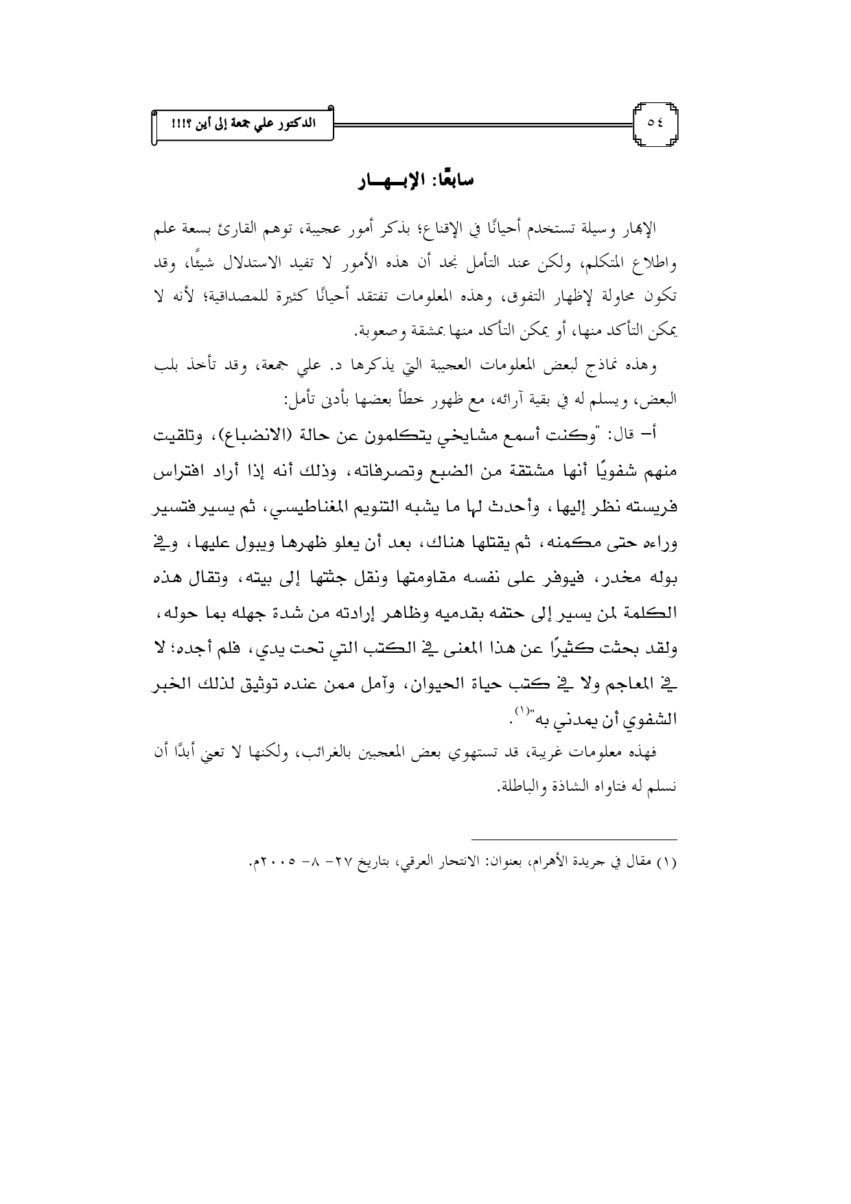 فهذه معلومات غريبة، قد تستهوي بعض المعجبين بالغرائب، ولكنها لا تعني أبدًا أن نسلم له فتاواه الشاذة والباطلة.