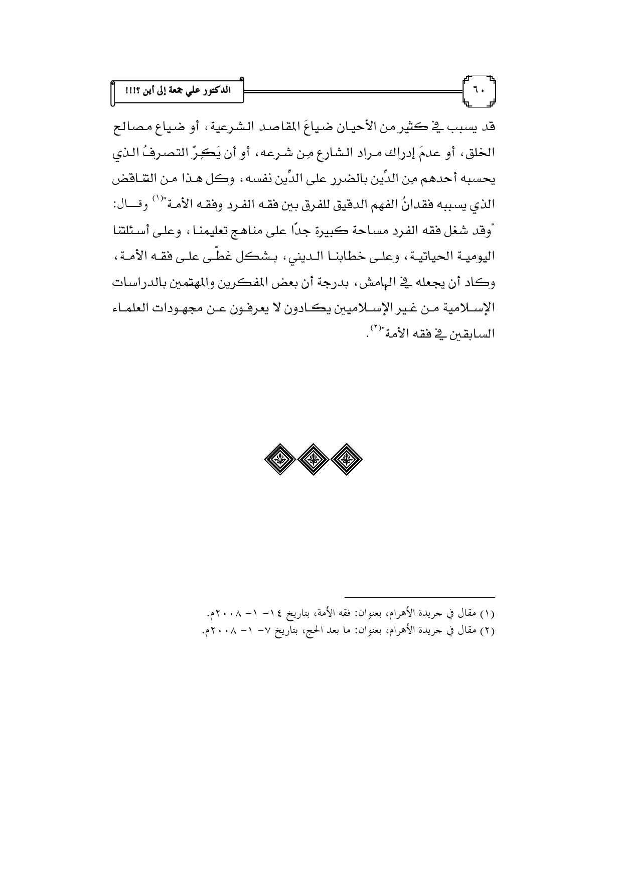 (¬1) مقال في جريدة الأهرام، بعنوان: فقه الأمة، بتاريخ 14 - 1 - 2008م.