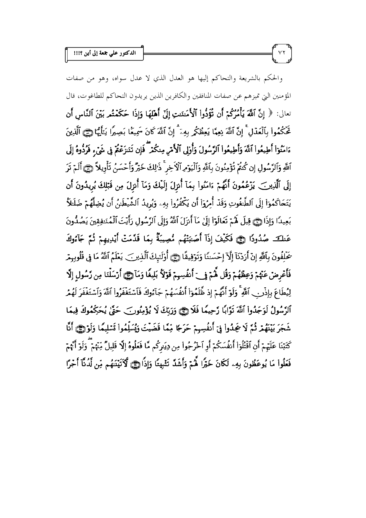 والحكم بالشريعة والتحاكم إليها هو العدل الذي لا عدل سواه، وهو من صفات المؤمنين التي تميزهم عن صفات المنافقين والكافرين الذين يريدون التحاكم للطاغوت، قال تعالى: {إِنَّ اللَّهَ يَأْمُرُكُمْ أَنْ تُؤَدُّوا الْأَمَانَاتِ إِلَى أَهْلِهَا وَإِذَا حَكَمْتُمْ بَيْنَ النَّاسِ أَنْ تَحْكُمُوا بِالْعَدْلِ إِنَّ اللَّهَ نِعِمَّا يَعِظُكُمْ بِهِ إِنَّ اللَّهَ كَانَ سَمِيعًا بَصِيرًا يَا أَيُّهَا الَّذِينَ آمَنُوا أَطِيعُوا اللَّهَ وَأَطِيعُوا الرَّسُولَ وَأُولِي الْأَمْرِ مِنْكُمْ فَإِنْ تَنَازَعْتُمْ فِي شَيْءٍ فَرُدُّوهُ إِلَى اللَّهِ وَالرَّسُولِ إِنْ كُنْتُمْ تُؤْمِنُونَ بِاللَّهِ وَالْيَوْمِ الْآخِرِ ذَلِكَ خَيْرٌ وَأَحْسَنُ تَأْوِيلًا أَلَمْ تَرَ إِلَى الَّذِينَ يَزْعُمُونَ أَنَّهُمْ آمَنُوا بِمَا أُنْزِلَ إِلَيْكَ وَمَا أُنْزِلَ مِنْ قَبْلِكَ يُرِيدُونَ أَنْ يَتَحَاكَمُوا إِلَى الطَّاغُوتِ وَقَدْ أُمِرُوا أَنْ يَكْفُرُوا بِهِ وَيُرِيدُ الشَّيْطَانُ أَنْ يُضِلَّهُمْ ضَلَالًا بَعِيدًا وَإِذَا قِيلَ لَهُمْ تَعَالَوْا إِلَى مَا أَنْزَلَ اللَّهُ وَإِلَى الرَّسُولِ رَأَيْتَ الْمُنَافِقِينَ يَصُدُّونَ عَنْكَ صُدُودًا فَكَيْفَ إِذَا أَصَابَتْهُمْ مُصِيبَةٌ بِمَا قَدَّمَتْ أَيْدِيهِمْ ثُمَّ جَاءُوكَ يَحْلِفُونَ بِاللَّهِ إِنْ أَرَدْنَا إِلَّا إِحْسَانًا وَتَوْفِيقًا أُولَئِكَ الَّذِينَ يَعْلَمُ اللَّهُ مَا فِي قُلُوبِهِمْ فَأَعْرِضْ عَنْهُمْ وَعِظْهُمْ وَقُلْ لَهُمْ فِي أَنْفُسِهِمْ قَوْلًا بَلِيغًا وَمَا أَرْسَلْنَا مِنْ رَسُولٍ إِلَّا لِيُطَاعَ بِإِذْنِ اللَّهِ وَلَوْ أَنَّهُمْ إِذْ ظَلَمُوا أَنْفُسَهُمْ جَاءُوكَ فَاسْتَغْفَرُوا اللَّهَ وَاسْتَغْفَرَ لَهُمُ الرَّسُولُ لَوَجَدُوا اللَّهَ تَوَّابًا رَحِيمًا فَلَا وَرَبِّكَ لَا يُؤْمِنُونَ حَتَّى يُحَكِّمُوكَ فِيمَا شَجَرَ بَيْنَهُمْ ثُمَّ لَا يَجِدُوا فِي أَنْفُسِهِمْ حَرَجًا مِمَّا قَضَيْتَ وَيُسَلِّمُوا تَسْلِيمًا وَلَوْ أَنَّا كَتَبْنَا عَلَيْهِمْ أَنِ اقْتُلُوا أَنْفُسَكُمْ أَوِ اخْرُجُوا مِنْ دِيَارِكُمْ مَا فَعَلُوهُ إِلَّا قَلِيلٌ مِنْهُمْ وَلَوْ أَنَّهُمْ فَعَلُوا مَا يُوعَظُونَ بِهِ لَكَانَ خَيْرًا لَهُمْ وَأَشَدَّ تَثْبِيتًا وَإِذًا لَآتَيْنَاهُمْ مِنْ لَدُنَّا أَجْرًا