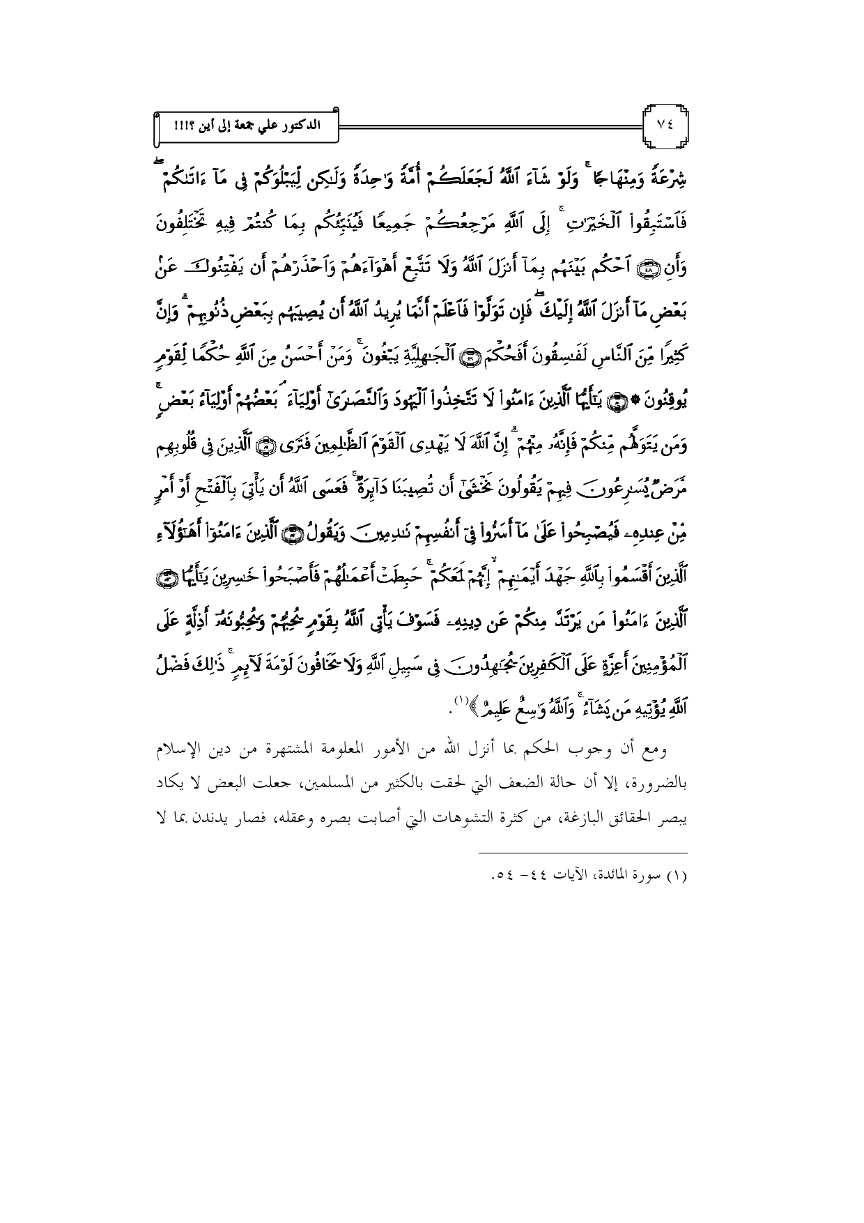 شِرْعَةً وَمِنْهَاجًا وَلَوْ شَاءَ اللَّهُ لَجَعَلَكُمْ أُمَّةً وَاحِدَةً وَلَكِنْ لِيَبْلُوَكُمْ فِي مَا آتَاكُمْ فَاسْتَبِقُوا الْخَيْرَاتِ إِلَى اللَّهِ مَرْجِعُكُمْ جَمِيعًا فَيُنَبِّئُكُمْ بِمَا كُنْتُمْ فِيهِ تَخْتَلِفُونَ وَأَنِ احْكُمْ بَيْنَهُمْ بِمَا أَنْزَلَ اللَّهُ وَلَا تَتَّبِعْ أَهْوَاءَهُمْ وَاحْذَرْهُمْ أَنْ يَفْتِنُوكَ عَنْ بَعْضِ مَا أَنْزَلَ اللَّهُ إِلَيْكَ فَإِنْ تَوَلَّوْا فَاعْلَمْ أَنَّمَا يُرِيدُ اللَّهُ أَنْ يُصِيبَهُمْ بِبَعْضِ ذُنُوبِهِمْ وَإِنَّ كَثِيرًا مِنَ النَّاسِ لَفَاسِقُونَ أَفَحُكْمَ الْجَاهِلِيَّةِ يَبْغُونَ وَمَنْ أَحْسَنُ مِنَ اللَّهِ حُكْمًا لِقَوْمٍ يُوقِنُونَ يَا أَيُّهَا الَّذِينَ آمَنُوا لَا تَتَّخِذُوا الْيَهُودَ وَالنَّصَارَى أَوْلِيَاءَ بَعْضُهُمْ أَوْلِيَاءُ بَعْضٍ وَمَنْ يَتَوَلَّهُمْ مِنْكُمْ فَإِنَّهُ مِنْهُمْ إِنَّ اللَّهَ لَا يَهْدِي الْقَوْمَ الظَّالِمِينَ فَتَرَى الَّذِينَ فِي قُلُوبِهِمْ مَرَضٌ يُسَارِعُونَ فِيهِمْ يَقُولُونَ نَخْشَى أَنْ تُصِيبَنَا دَائِرَةٌ فَعَسَى اللَّهُ أَنْ يَأْتِيَ بِالْفَتْحِ أَوْ أَمْرٍ مِنْ عِنْدِهِ فَيُصْبِحُوا عَلَى مَا أَسَرُّوا فِي أَنْفُسِهِمْ نَادِمِينَ وَيَقُولُ الَّذِينَ آمَنُوا أَهَؤُلَاءِ الَّذِينَ أَقْسَمُوا بِاللَّهِ جَهْدَ أَيْمَانِهِمْ إِنَّهُمْ لَمَعَكُمْ حَبِطَتْ أَعْمَالُهُمْ فَأَصْبَحُوا خَاسِرِينَ يَا أَيُّهَا الَّذِينَ آمَنُوا مَنْ يَرْتَدَّ مِنْكُمْ عَنْ دِينِهِ فَسَوْفَ يَأْتِي اللَّهُ بِقَوْمٍ يُحِبُّهُمْ وَيُحِبُّونَهُ أَذِلَّةٍ عَلَى الْمُؤْمِنِينَ أَعِزَّةٍ عَلَى الْكَافِرِينَ يُجَاهِدُونَ فِي سَبِيلِ اللَّهِ وَلَا يَخَافُونَ لَوْمَةَ لَائِمٍ ذَلِكَ فَضْلُ اللَّهِ يُؤْتِيهِ مَنْ يَشَاءُ وَاللَّهُ وَاسِعٌ عَلِيمٌ} (¬1).