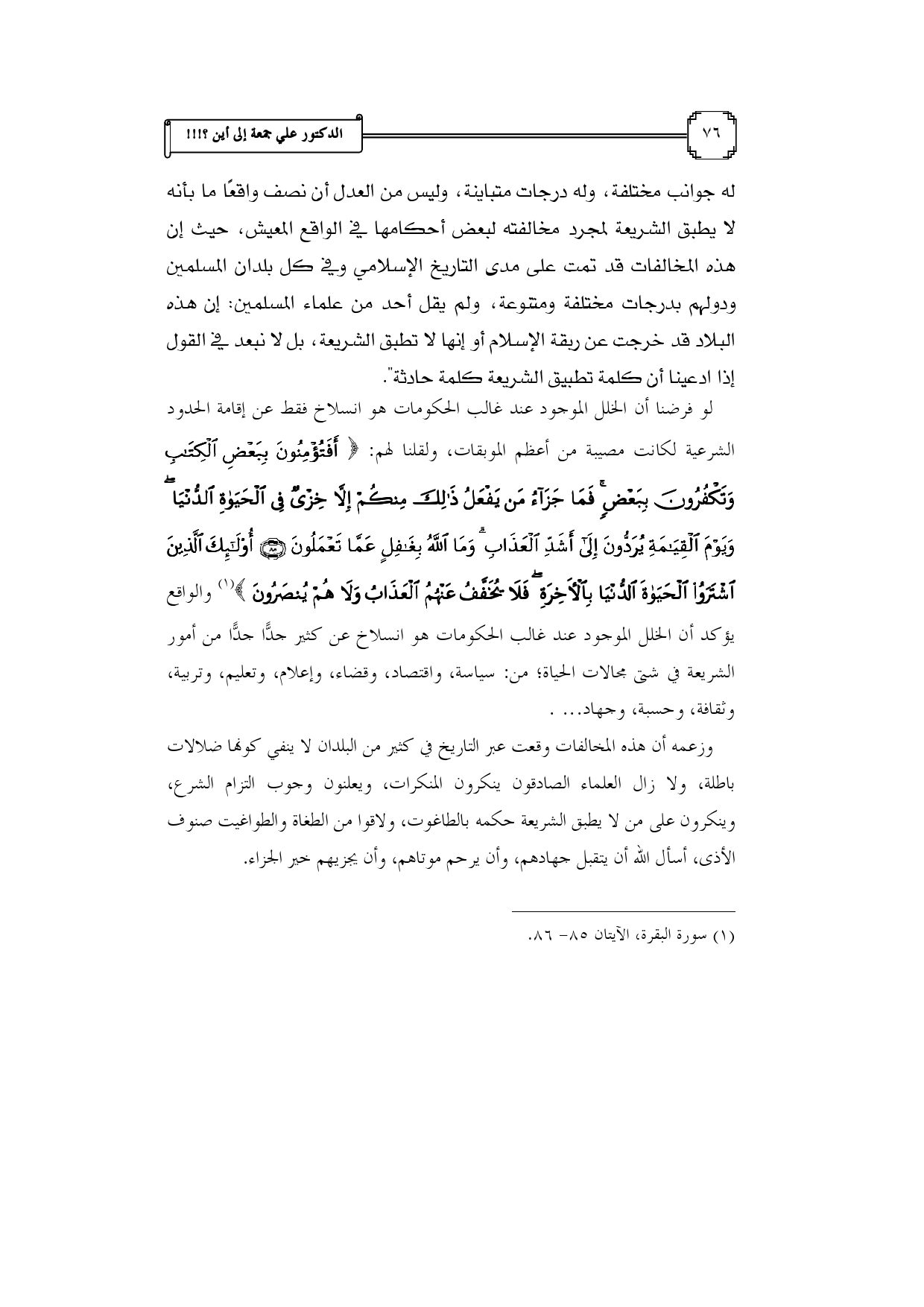لو فرضنا أن الخلل الموجود عند غالب الحكومات هو انسلاخ فقط عن إقامة الحدود الشرعية لكانت مصيبة من أعظم الموبقات، ولقلنا لهم: {أَفَتُؤْمِنُونَ بِبَعْضِ الْكِتَابِ وَتَكْفُرُونَ بِبَعْضٍ فَمَا جَزَاءُ مَنْ يَفْعَلُ ذَلِكَ مِنْكُمْ إِلَّا خِزْيٌ فِي الْحَيَاةِ الدُّنْيَا وَيَوْمَ الْقِيَامَةِ يُرَدُّونَ إِلَى أَشَدِّ الْعَذَابِ وَمَا اللَّهُ بِغَافِلٍ عَمَّا تَعْمَلُونَ أُولَئِكَ الَّذِينَ اشْتَرَوُا الْحَيَاةَ الدُّنْيَا بِالْآخِرَةِ فَلَا يُخَفَّفُ عَنْهُمُ الْعَذَابُ وَلَا هُمْ يُنْصَرُونَ} (¬1) والواقع يؤكد أن الخلل الموجود عند غالب الحكومات هو انسلاخ عن كثير جدًّا جدًّا من أمور الشريعة في شتى مجالات الحياة؛ من: سياسة، واقتصاد، وقضاء، وإعلام، وتعليم، وتربية، وثقافة، وحسبة، وجهاد ... .