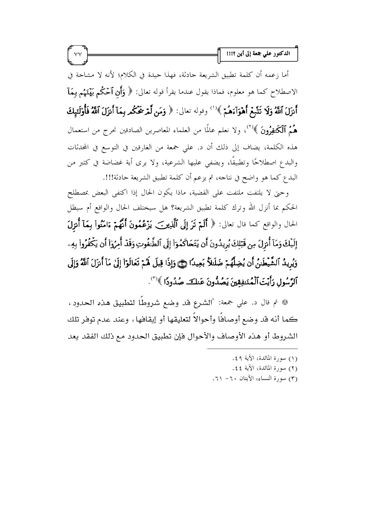 أما زعمه أن كلمة تطبيق الشريعة حادثة، فهذا حيدة في الكلام؛ لأنه لا مشاحة في الاصطلاح كما هو معلوم، فماذا يقول عندما يقرأ قوله تعالى: {وَأَنِ احْكُمْ بَيْنَهُمْ بِمَا أَنْزَلَ اللَّهُ وَلَا تَتَّبِعْ أَهْوَاءَهُمْ} (¬1) وقوله تعالى: {وَمَنْ لَمْ يَحْكُمْ بِمَا أَنْزَلَ اللَّهُ فَأُولَئِكَ هُمُ الْكَافِرُونَ} (¬2)، ولا نعلم عالمًا من العلماء المعاصرين الصادقين تحرج من استعمال هذه الكلمة، يضاف إلى ذلك أن د. علي جمعة من الغارقين في التوسع في المحدثات والبدع اصطلاحًا وتطبيقًا، ويضفي عليها الشرعية، ولا يرى أية غضاضة في كثير من البدع كما هو واضح في نتاجه، ثم يزعم أن كلمة تطبيق الشريعة حادثة!!!.