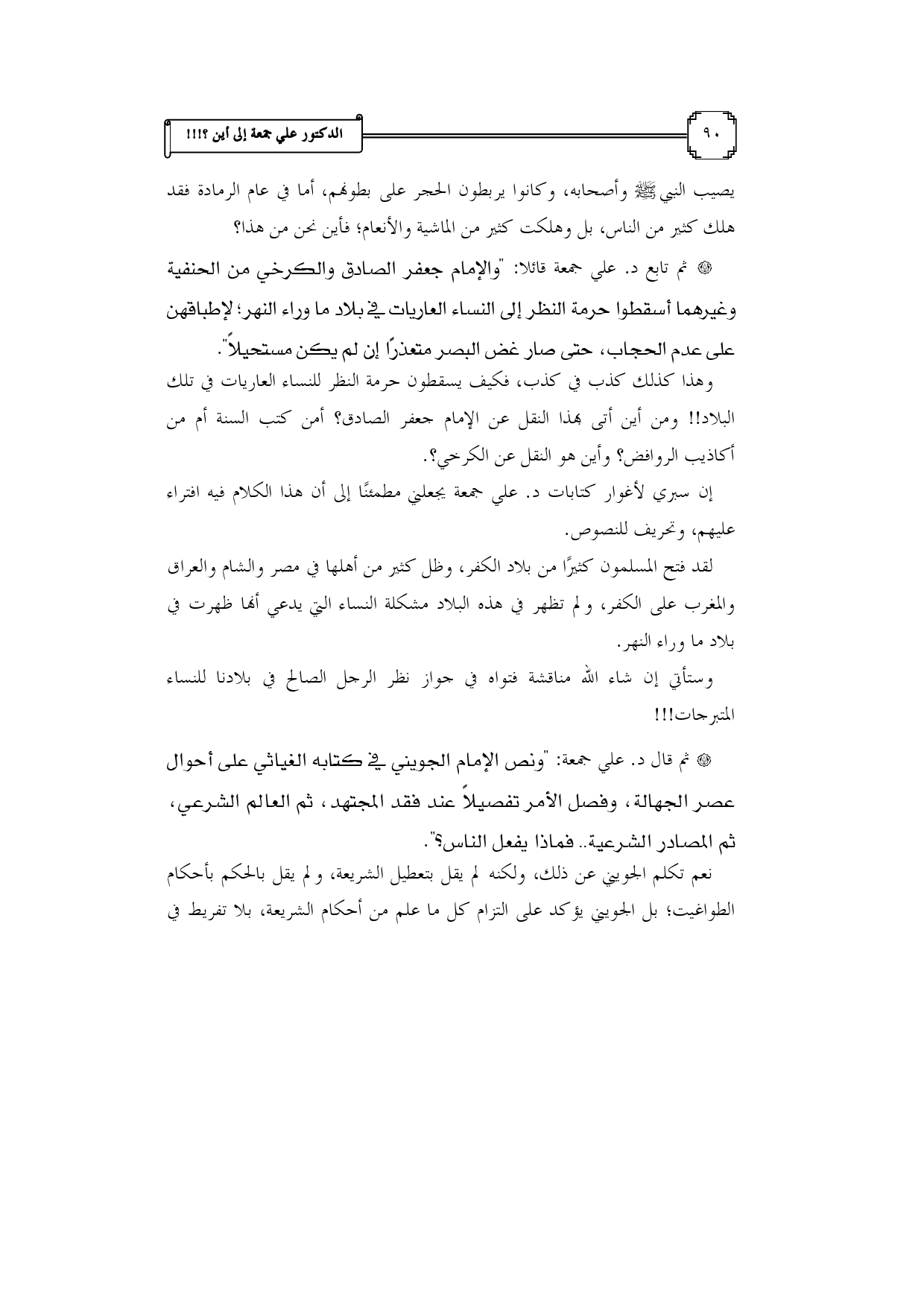 * ثم تابع د. علي جمعة قائلا: "والإمام جعفر الصادق والكرخي من الحنفية وغيرهما أسقطوا حرمة النظر إلى النساء العاريات في بلاد ما وراء النهر؛ لإطباقهن على عدم الحجاب، حتى صار غض البصر متعذرًا إن لم يكن مستحيلاً".