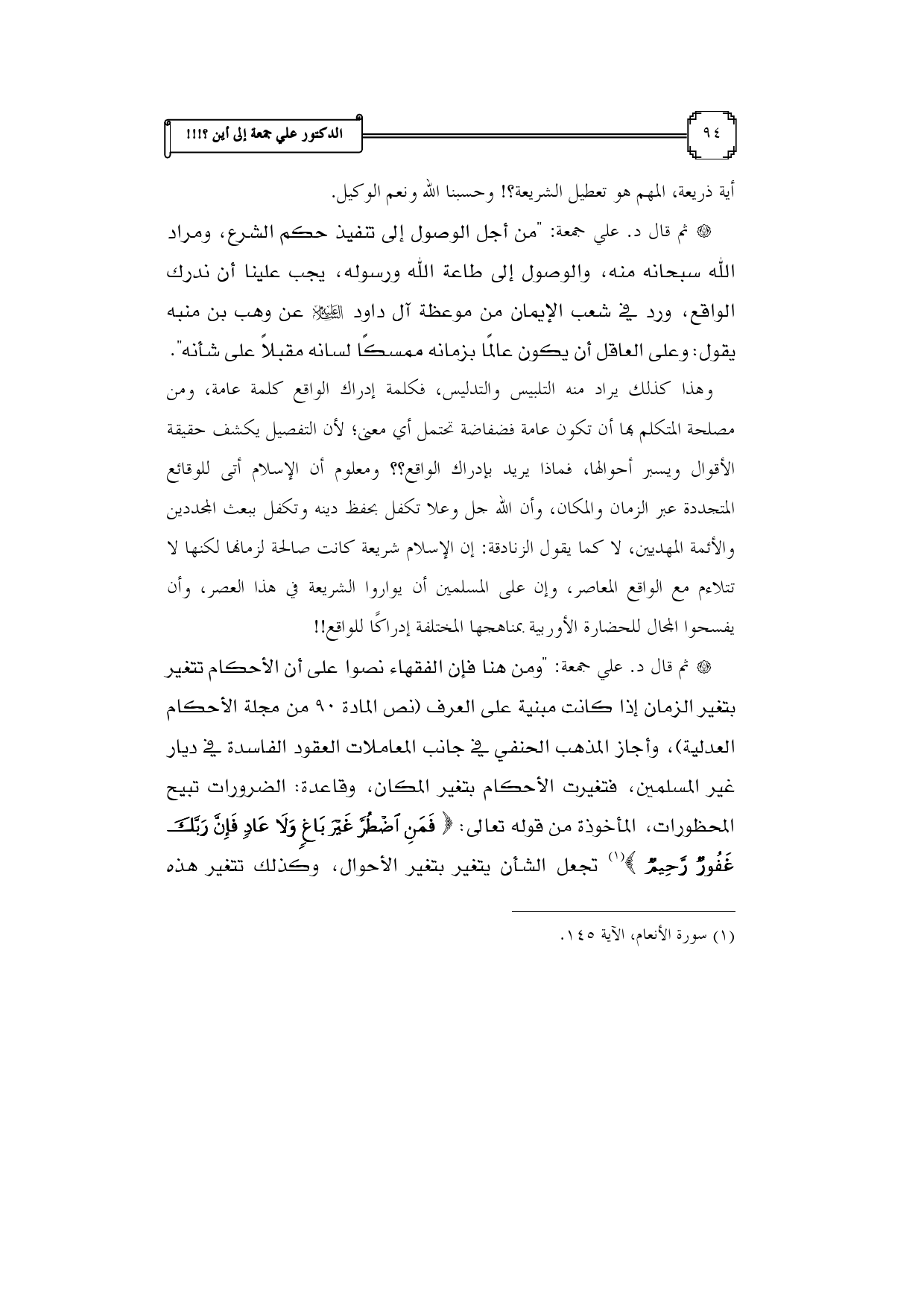 * ثم قال د. علي جمعة: "ومن هنا فإن الفقهاء نصوا على أن الأحكام تتغير بتغير الزمان إذا كانت مبنية على العرف (نص المادة 90 من مجلة الأحكام العدلية)، وأجاز المذهب الحنفي في جانب المعاملات العقود الفاسدة في ديار غير المسلمين، فتغيرت الأحكام بتغير المكان، وقاعدة: الضرورات تبيح المحظورات، المأخوذة من قوله تعالى: {فَمَنِ اضْطُرَّ غَيْرَ بَاغٍ وَلَا عَادٍ فَإِنَّ رَبَّكَ غَفُورٌ رَحِيمٌ} (¬1) تجعل الشأن يتغير بتغير الأحوال، وكذلك تتغير هذه