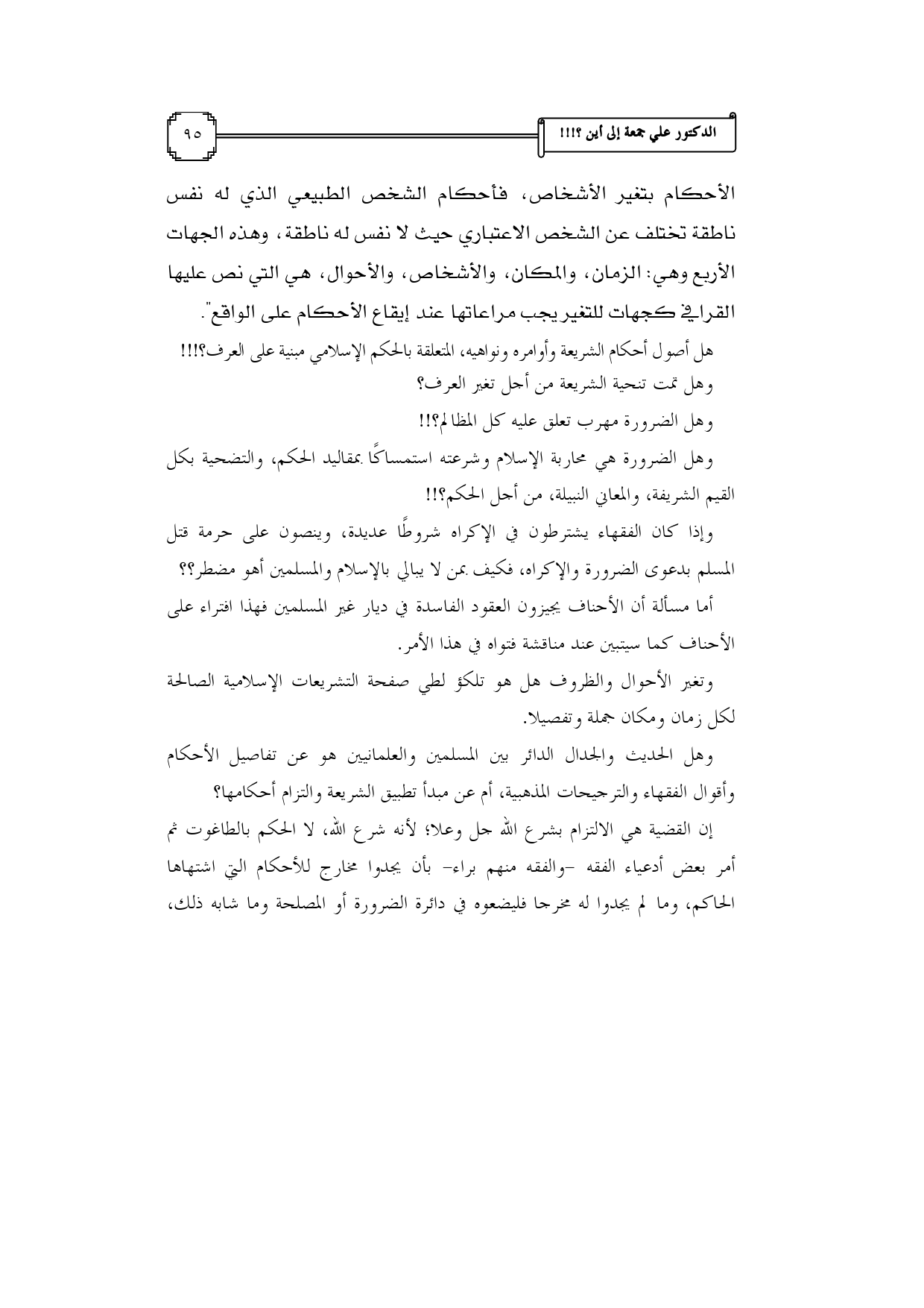 الأحكام بتغير الأشخاص، فأحكام الشخص الطبيعي الذي له نفس ناطقة تختلف عن الشخص الاعتباري حيث لا نفس له ناطقة، وهذه الجهات الأربع وهي: الزمان، والمكان، والأشخاص، والأحوال، هي التي نص عليها القرافي كجهات للتغير يجب مراعاتها عند إيقاع الأحكام على الواقع".