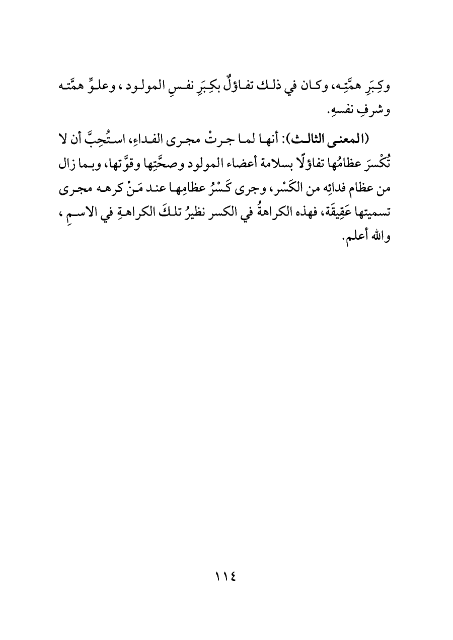 (المعنى الثالث): أنها لما جرتْ مجرى الفداءِ، استُحِبَّ أن لا تُكْسرَ عظامُها تفاؤلًا بسلامة أعضاء المولود وصحَّتِها وقوَّتها، وبما زال من عظام فدائِه من الكَسْر، وجرى كَسْرُ عظامِها عند مَنْ كرهه مجرى تسميتها عَقِيقَة، فهذه الكراهةُ في الكسر نظيرُ تلكَ الكراهةِ في الاسمِ، والله أعلم.
