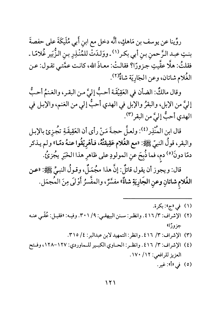 (¬٢) الإشراف: ٣/ ٤١٦. وانظر: سنن البيهقي: ٩/ ٣٠١. وفيه: "فقيل: عُقّي عنه جزورًا"