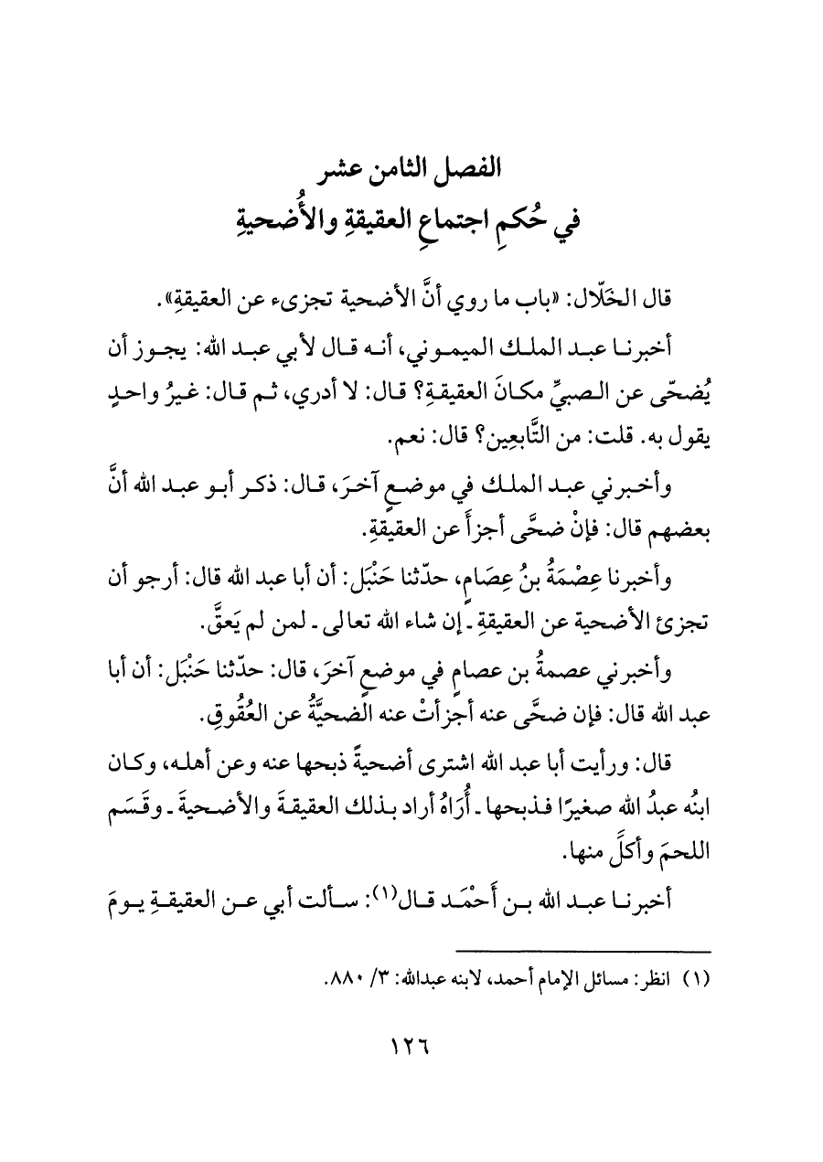 وأخبرني عصمةُ بن عصامٍ في موضعٍ آخرَ، قال: حدّثنا حَنْبَل: أن أبا عبد الله قال: فإن ضحَّى عنه أجزأتْ عنه الضحيَّةُ عن العُقُوقِ.