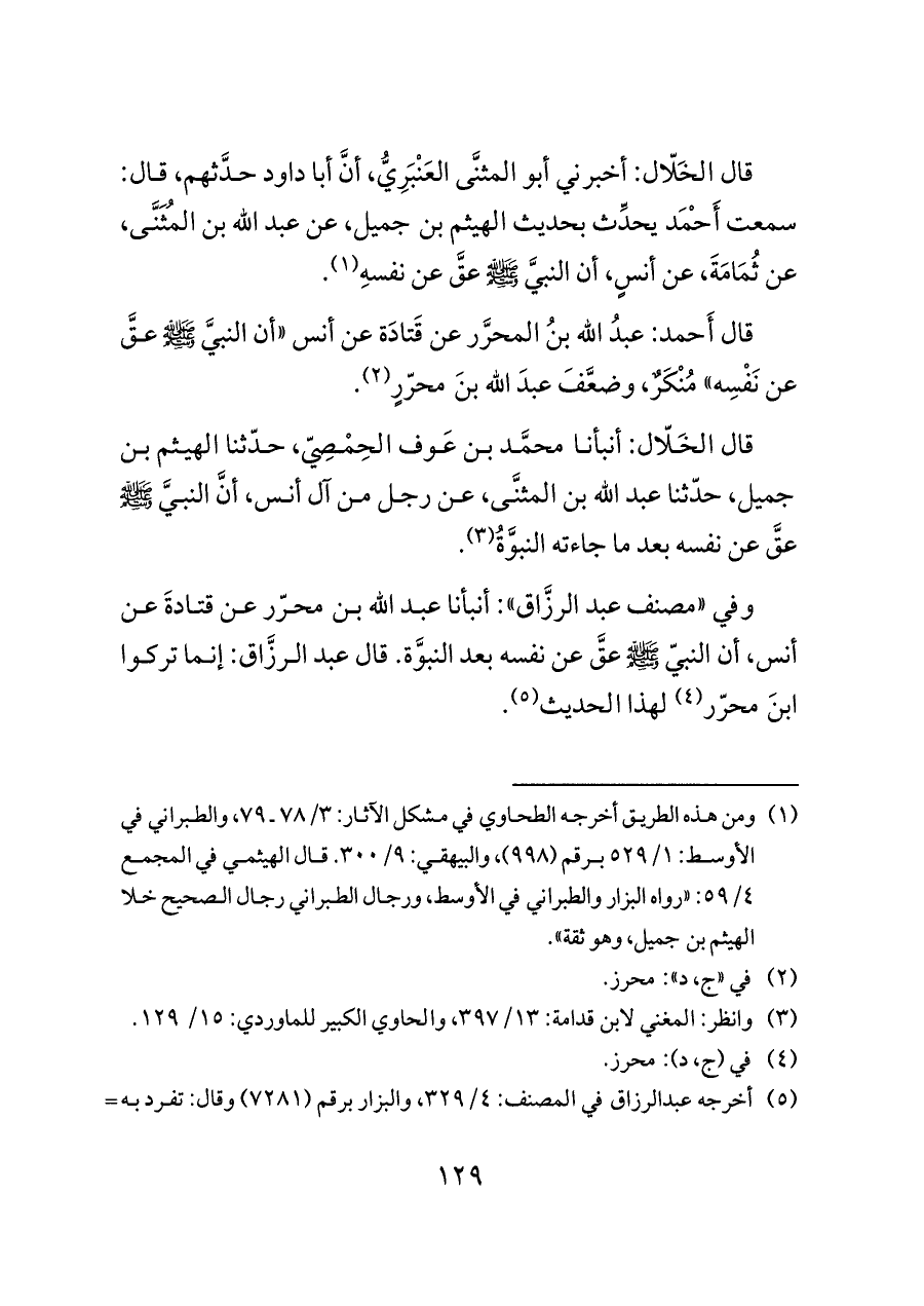 (¬٥) أخرجه عبدالرزاق في المصنف: ٤/ ٣٢٩، والبزار برقم (٧٢٨١) وقال: تفرد به عبدالله وهو ضعيف، وابن عدي في الكامل: ٥/ ٢١، وابن حبان في المجروحين: ٢/ ٢٣.