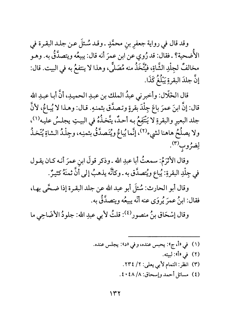 وقد قال في رواية جعفرِ بنِ محمَّدٍ ـ وقد سُئلَ عن جلد البقرة في الأُضحية؟ ـ فقال: قد رُوي عن ابن عمرَ أنه قال: يبيعُه ويتصدَّقُ به. وهو مخالفٌ لجِلْدِ الشَّاةِ، فيُتَّخَذُ منه مُصَلًّى، وهذا لا ينتفعُ به في البيت. قال: إنَّ جلدَ البقرةِ يَبْلُغُ كَذَا.