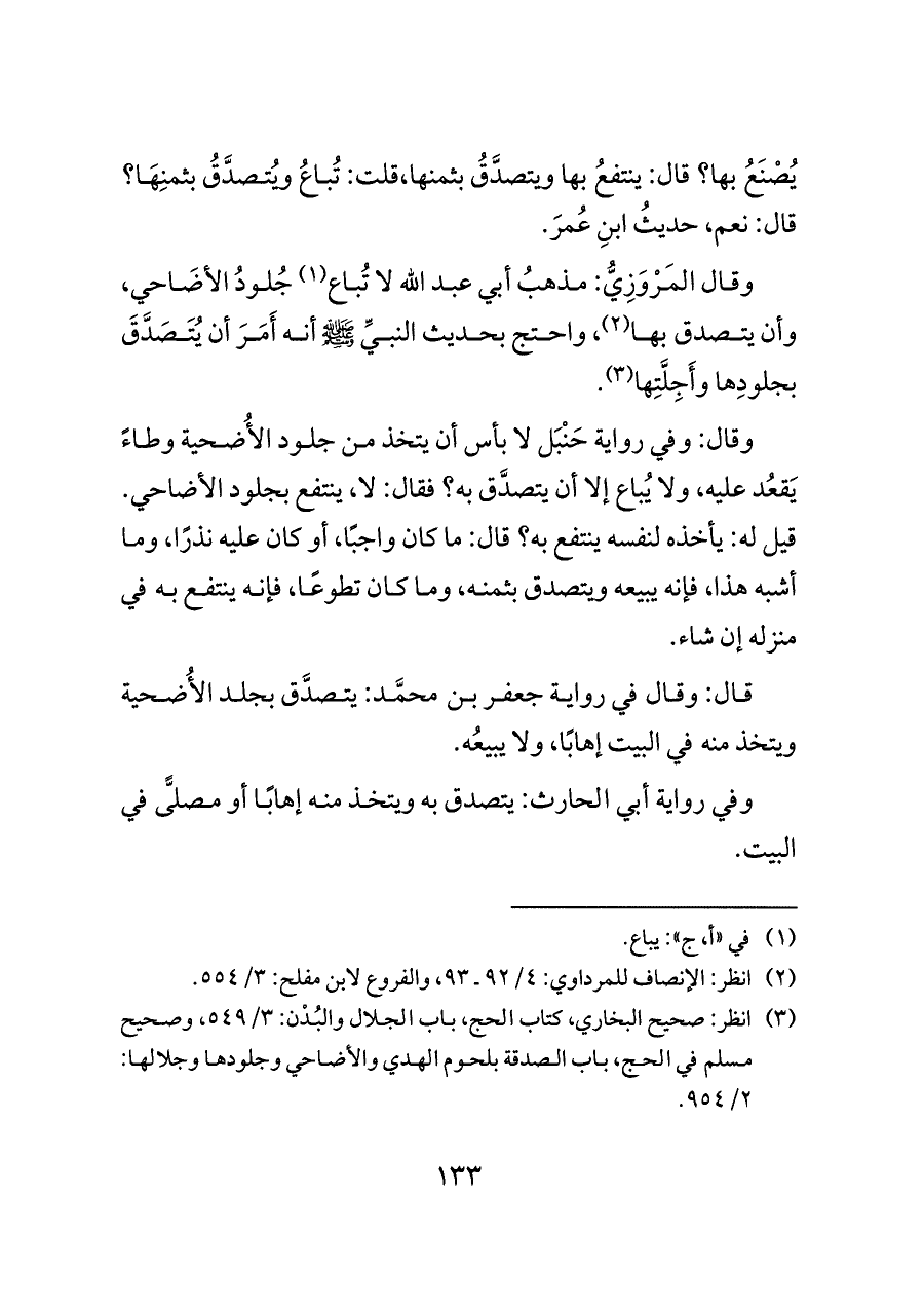 (¬٣) انظر: صحيح البخاري، كتاب الحج، باب الجلال والبُدْن: ٣/ ٥٤٩، وصحيح مسلم في الحج، باب الصدقة بلحوم الهدي والأضاحي وجلودها وجلالها: ٢/ ٩٥٤.