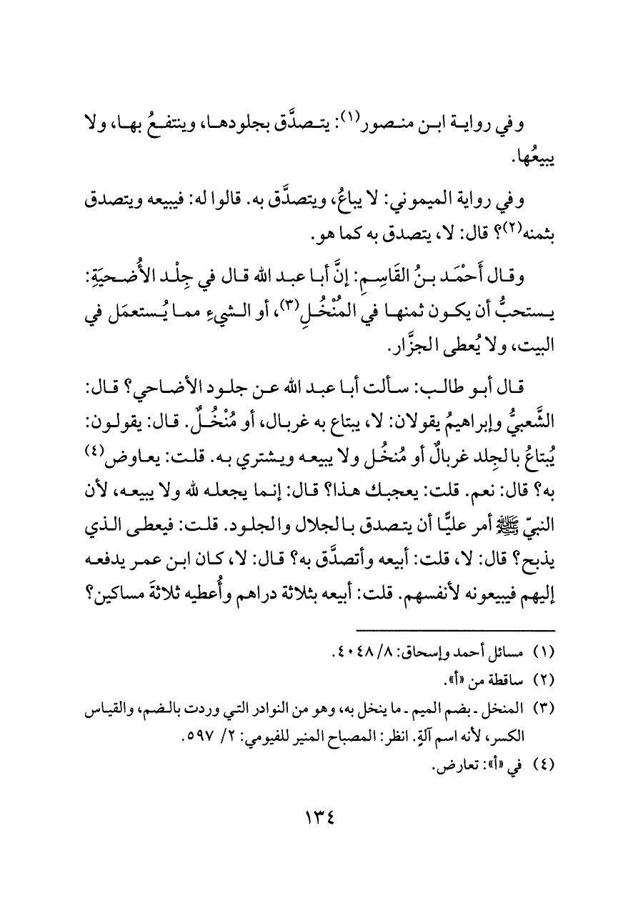 قال أبو طالب: سألت أبا عبد الله عن جلود الأضاحي؟ قال: الشَّعبيُّ وإبراهيمُ يقولان: لا، يبتاع به غربال، أو مُنْخُلٌ. قال: يقولون: يُبتاعُ بالجِلد غربالٌ أو مُنخُل ولا يبيعه ويشتري به. قلت: يعاوض (¬٤) به؟ قال: نعم. قلت: يعجبك هذا؟ قال: إنما يجعله لله ولا يبيعه، لأن النبيّ - صلى الله عليه وسلم - أمر عليًّا أن يتصدق بالجلال والجلود. قلت: فيعطى الذي يذبح؟ قال: لا، قلت: أبيعه وأتصدَّق به؟ قال: لا، كان ابن عمر يدفعه إليهم فيبيعونه لأنفسهم. قلت: أبيعه بثلاثة دراهم وأُعطيه ثلاثةَ مساكين؟