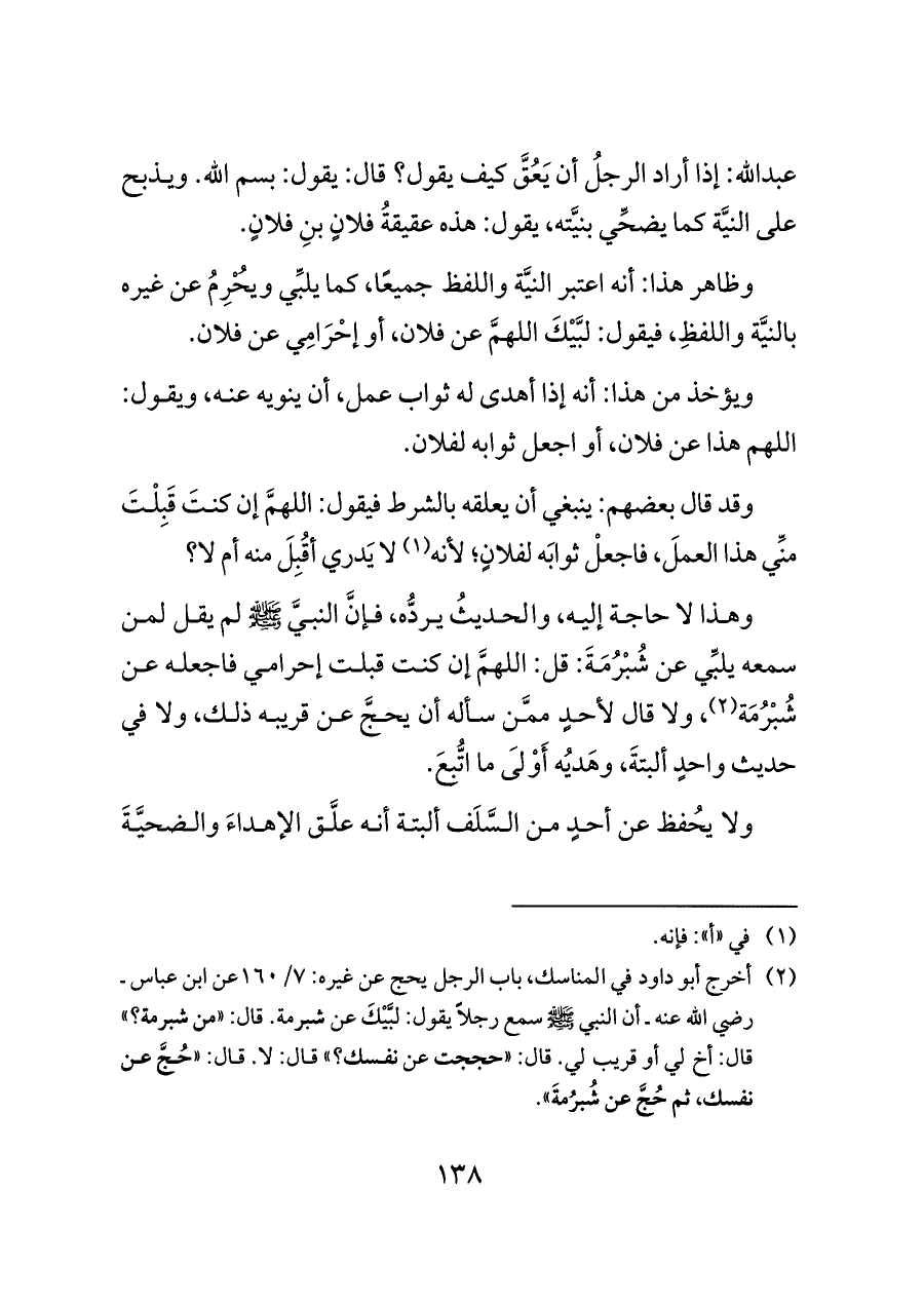 وهذا لا حاجة إليه، والحديثُ يردُّه، فإنَّ النبيَّ - صلى الله عليه وسلم - لم يقل لمن سمعه يلبِّي عن شُبْرُمَةَ: قل: اللهمَّ إن كنت قبلت إحرامي فاجعله عن شُبْرُمَة (¬٢)، ولا قال لأحدٍ ممَّن سأله أن يحجَّ عن قريبه ذلك، ولا في حديث واحدٍ ألبتةَ، وهَديُه أَوْلَى ما اتُّبِعَ.