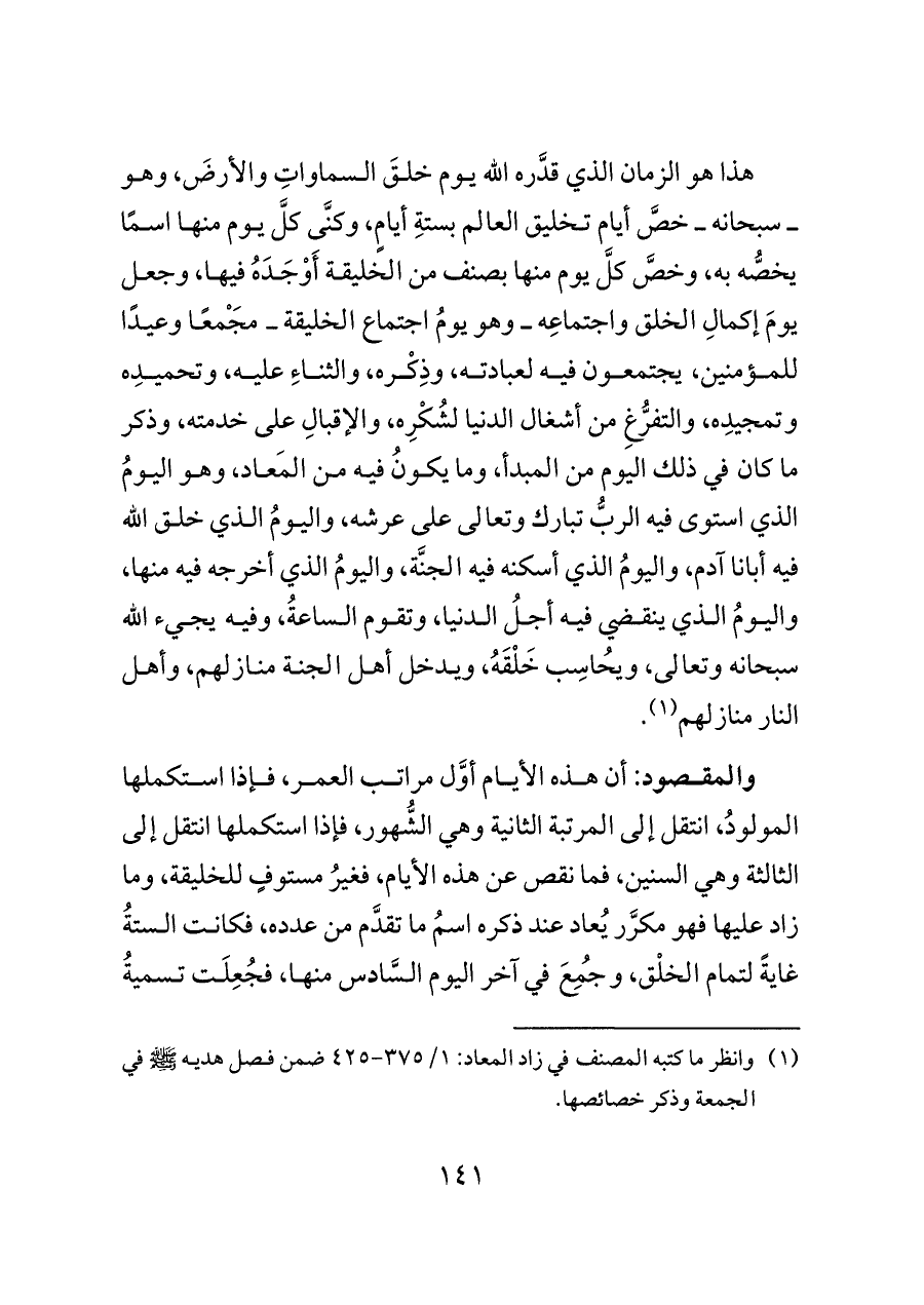 هذا هو الزمان الذي قدَّره الله يوم خلقَ السماواتِ والأرضَ، وهو ــ سبحانه ــ خصَّ أيام تخليق العالم بستةِ أيامٍ، وكنَّى كلَّ يوم منها اسمًا يخصُّه به، وخصَّ كلَّ يوم منها بصنف من الخليقة أَوْجَدَهُ فيها، وجعل يومَ إكمالِ الخلق واجتماعِه ــ وهو يومُ اجتماع الخليقة ــ مَجْمعًا وعيدًا للمؤمنين، يجتمعون فيه لعبادته، وذِكْره، والثناءِ عليه، وتحميدِه وتمجيدِه، والتفرُّغِ من أشغال الدنيا لشُكْرِه، والإقبالِ على خدمته، وذكر ما كان في ذلك اليوم من المبدأ، وما يكونُ فيه من المَعاد، وهو اليومُ الذي استوى فيه الربُّ تبارك وتعالى على عرشه، واليومُ الذي خلق الله فيه أبانا آدم، واليومُ الذي أسكنه فيه الجنَّة، واليومُ الذي أخرجه فيه منها، واليومُ الذي ينقضي فيه أجلُ الدنيا، وتقوم الساعةُ، وفيه يجيء الله سبحانه وتعالى، ويُحاسِب خَلْقَهُ، ويدخل أهل الجنة منازلهم، وأهل النار منازلهم (¬١).