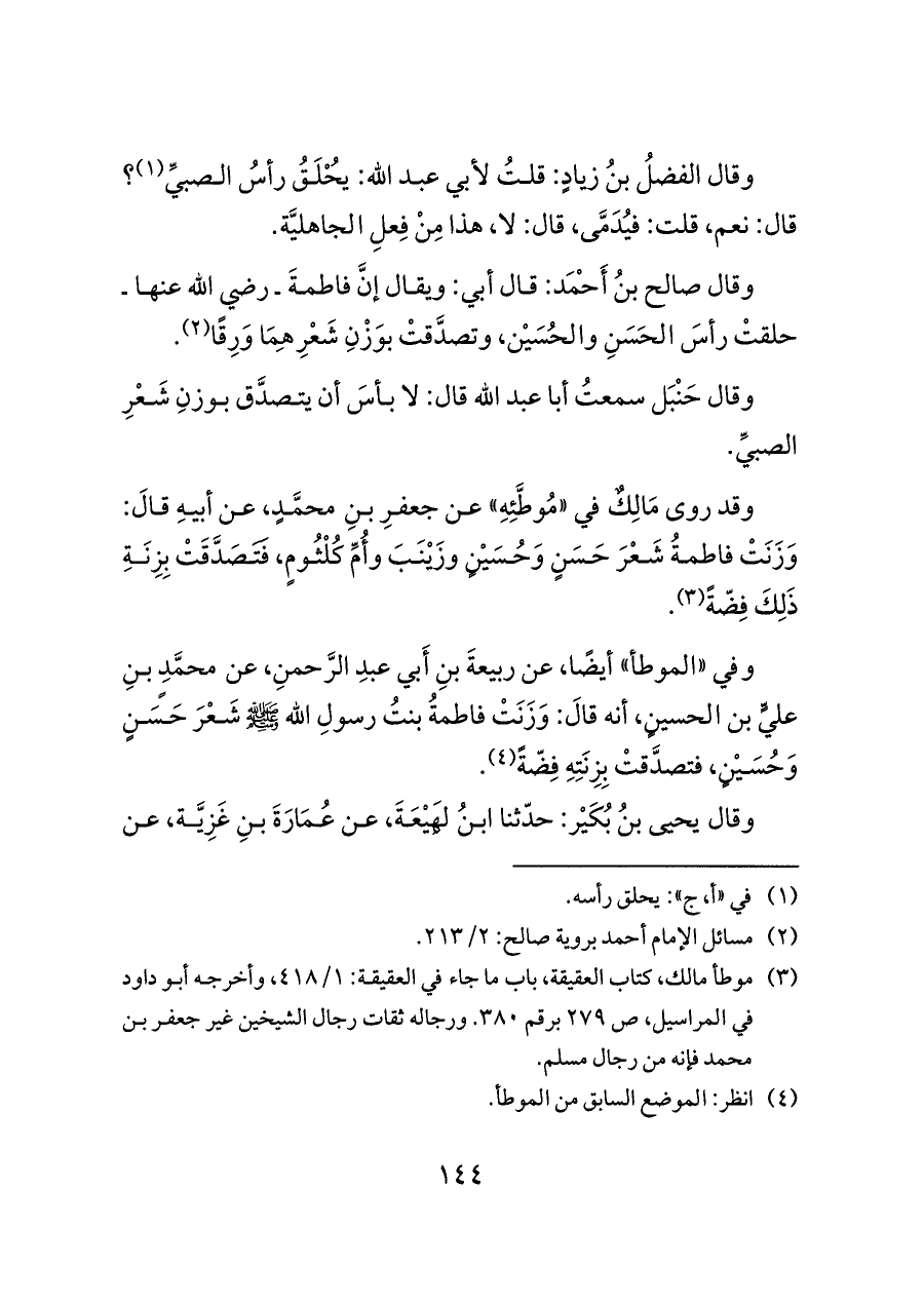 وقال صالح بنُ أَحْمَد: قال أبي: ويقال إنَّ فاطمةَ ـ رضي الله عنها ـ حلقتْ رأسَ الحَسَنِ والحُسَيْن، وتصدَّقتْ بوَزْنِ شَعْرِهِمَا وَرِقًا (¬٢).