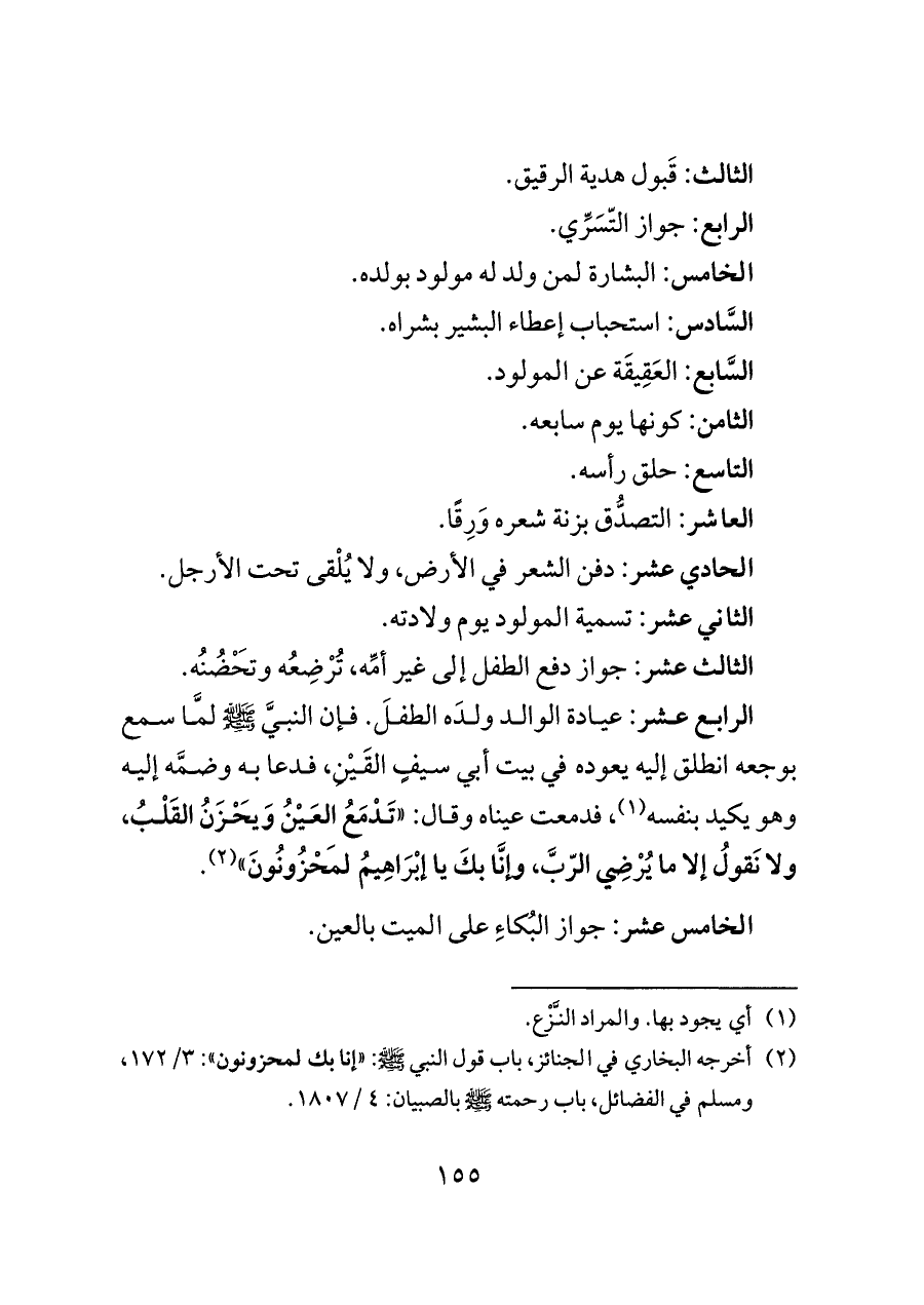 الرابع عشر: عيادة الوالد ولدَه الطفلَ. فإن النبيَّ - صلى الله عليه وسلم - لمَّا سمع بوجعه انطلق إليه يعوده في بيت أبي سيفٍ القَيْنِ، فدعا به وضمَّه إليه وهو يكيد بنفسه (¬١)، فدمعت عيناه وقال: "تَدْمَعُ العَيْنُ وَيَحْزَنُ القَلْبُ، ولا نَقولُ إلا ما يُرْضِي الرّبَّ، وإنَّا بكَ يا إبْرَاهِيمُ لَمَحْزُونُونَ" (¬٢).