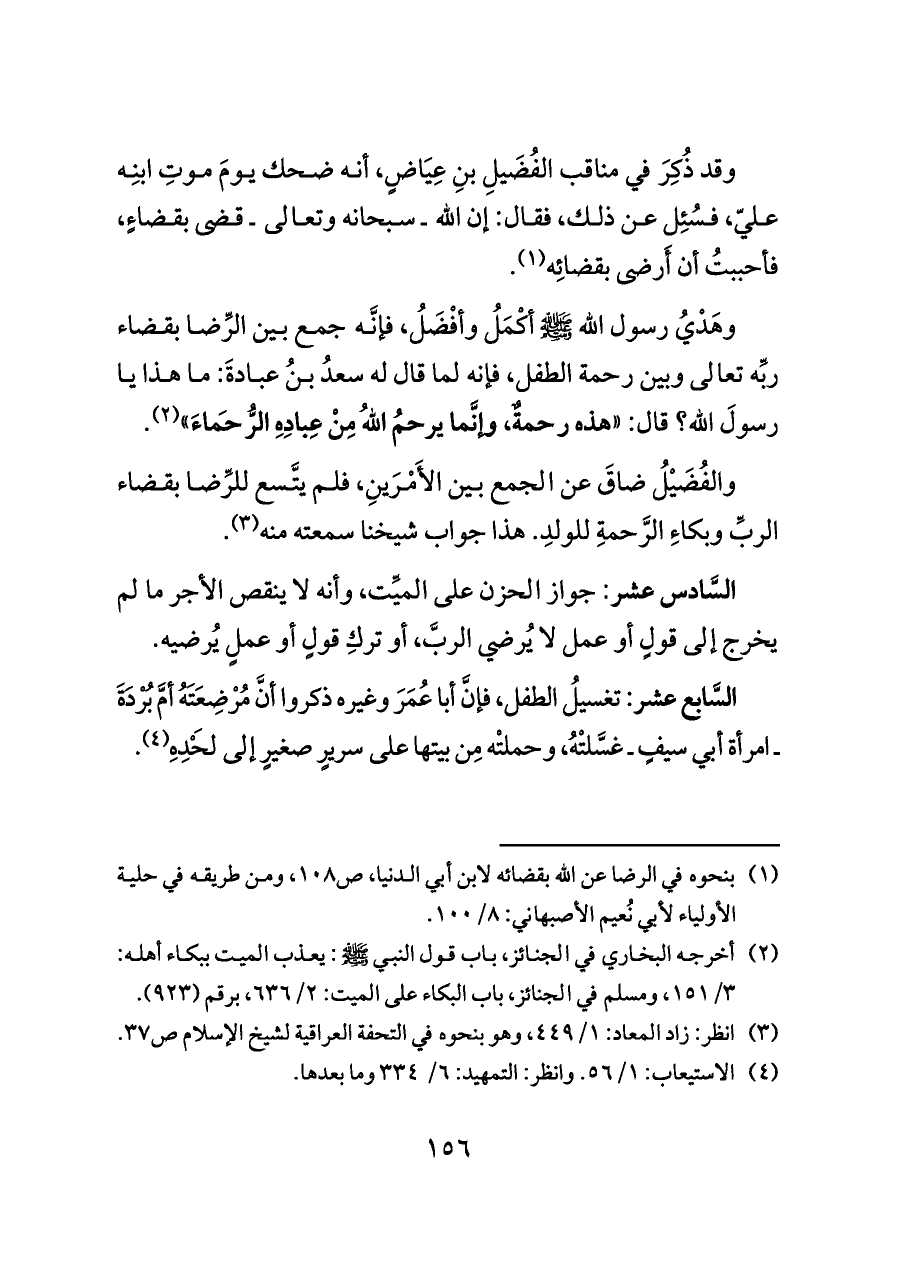 وقد ذُكِرَ في مناقب الفُضَيلِ بنِ عِيَاضٍ، أنه ضحك يومَ موتِ ابنِه عليّ، فسُئِل عن ذلك، فقال: إن الله ـ سبحانه وتعالى ـ قضى بقضاءٍ، فأحببتُ أن أَرضى بقضائِه (¬١).