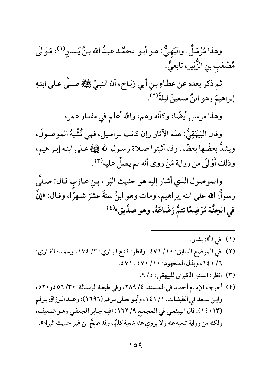 وقال البَيهَقِيُّ: هذه الآثار وإن كانت مراسيل، فهي تُشْبهُ الموصولَ، ويشدُّ بعضُها بعضًا. وقد أثبتوا صلاة رسول الله - صلى الله عليه وسلم - على ابنه إبراهيم، وذلك أَوْلَى من رواية مَنْ روى أنه لم يصلِّ عليه (¬٣).