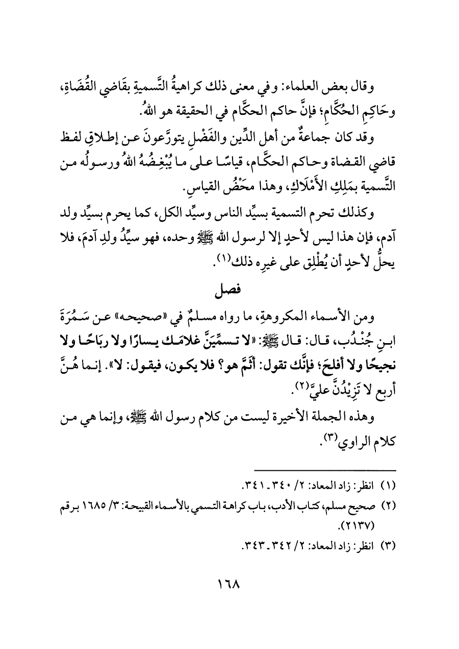 ومن الأسماء المكروهةِ، ما رواه مسلمٌ في "صحيحه" عن سَمُرَةَ ابنِ جُنْدُب، قال: قال - صلى الله عليه وسلم -: "لا تسمِّيَنَّ غلامَك يسارًا ولا ربَاحًا ولا نجيحًا ولا أفلحَ؛ فإنَّك تقول: أثَمَّ هو؟ فلا يكون، فيقول: لا". إنما هُنَّ أربع لا تَزِيْدُنَّ عليَّ (¬٢).
